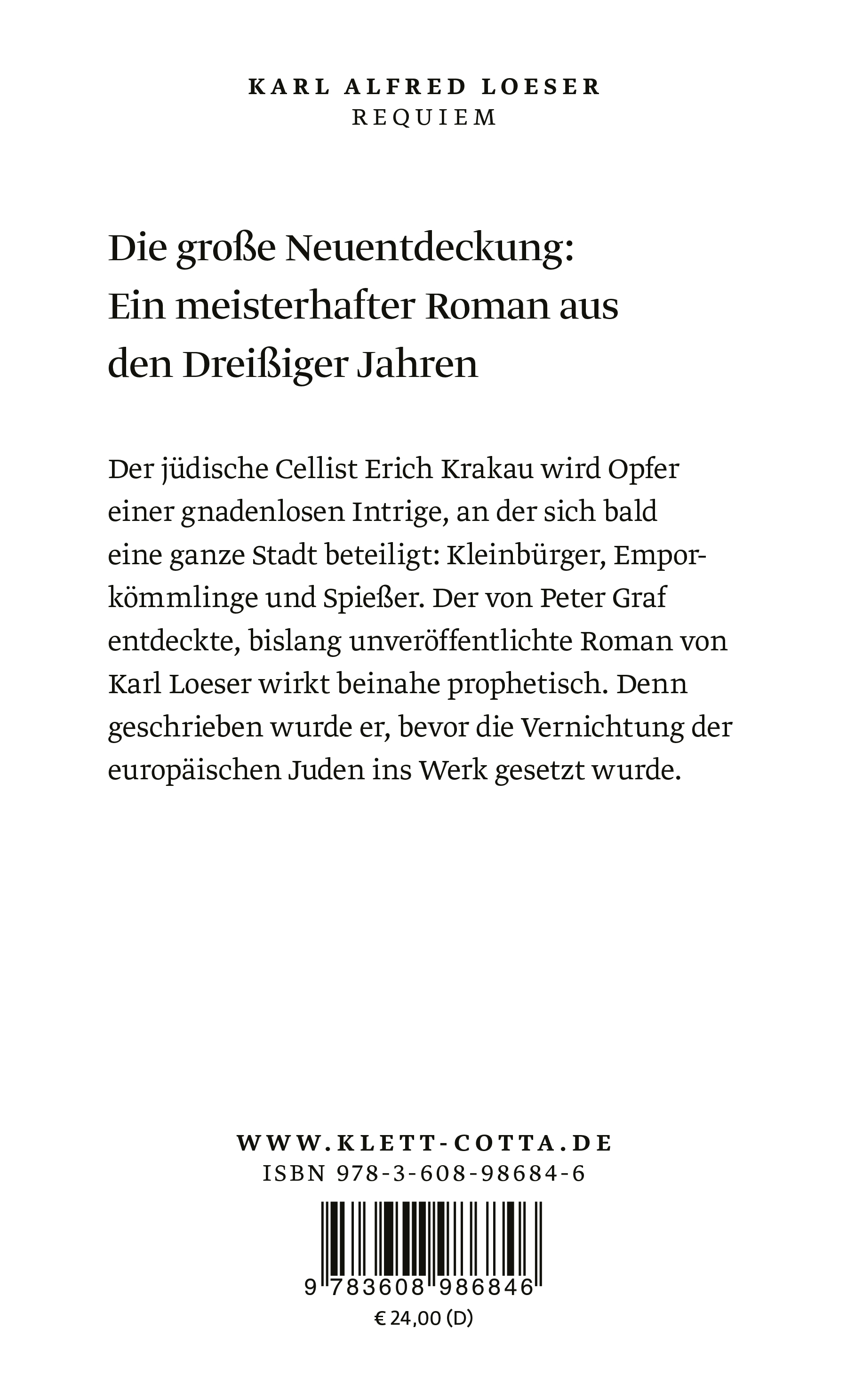 Der jüdische Cellist Erich Krakau wird Opfer einer gnadenlosen Intrige, an der sich bald eine ganze Stadt beteiligt: Kleinbürger, Emporkömmlinge und Spießer. Der von Peter Graf entdeckte, bislang unveröffentlichte Roman von Karl Loeser wirkt beinahe prophetisch. Denn geschrieben wurde er, bevor die Vernichtung der europäischen Juden ins Werk gesetzt wurde.