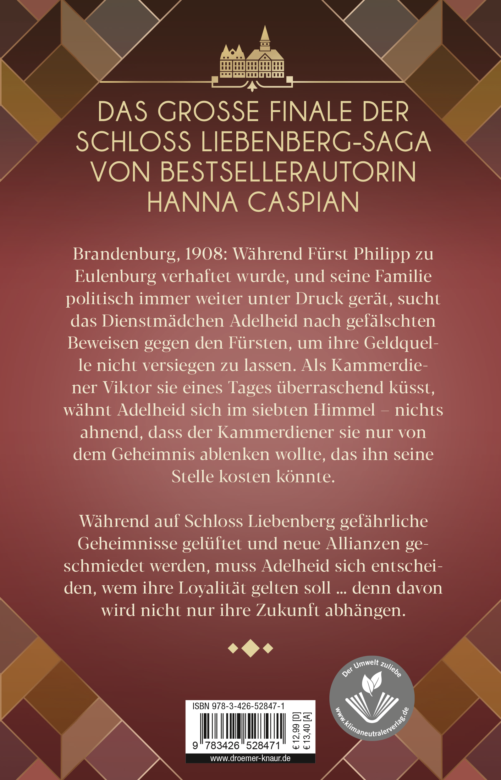| Schlagworte | Butler • Das Haus am Eaton Place • Deutsches Kaiserreich • Dienstmädchen • Eulenburg-Affäre • Familiensaga • Fürstenpaar • Gosford Park • Hanna Caspian • Hanna Caspian Gut Greifenau • Hanna Caspian Reihenfolge • HInter dem falschen Glanz • Hinter dem hellen Schein • historienromane • historische Familienromane • historische familiensaga • historische Frauenromane • Historische Romane • historische romane 20. jahrhundert • Historische Romane Deutschland • Historische Romane Serie • Liebe • Liebenberg Band 3 • Liebenberg Reihenfolge • Löwenberger Land • Mark Brandenburg • Schloss Liebenberg • Skandal • Spion |