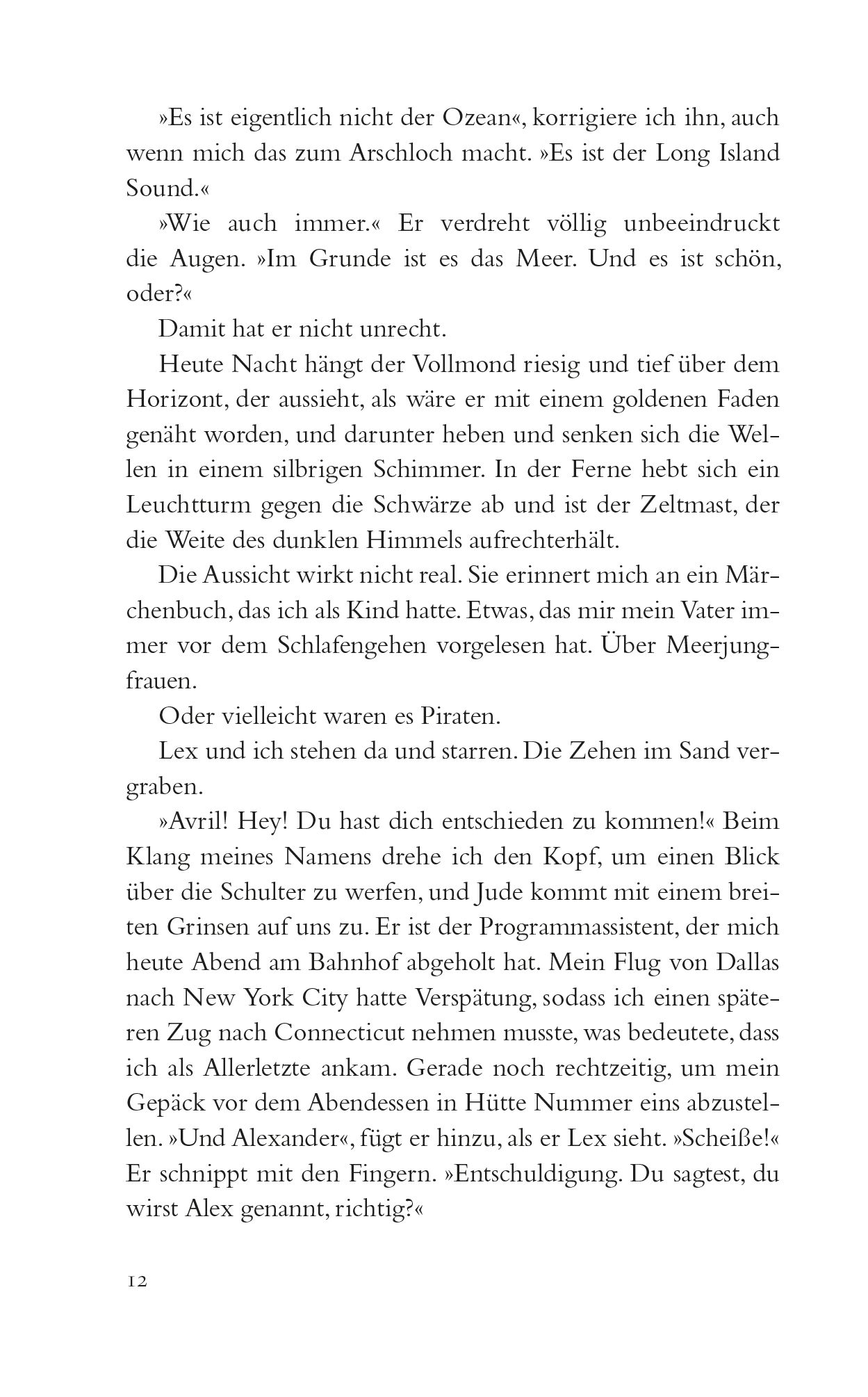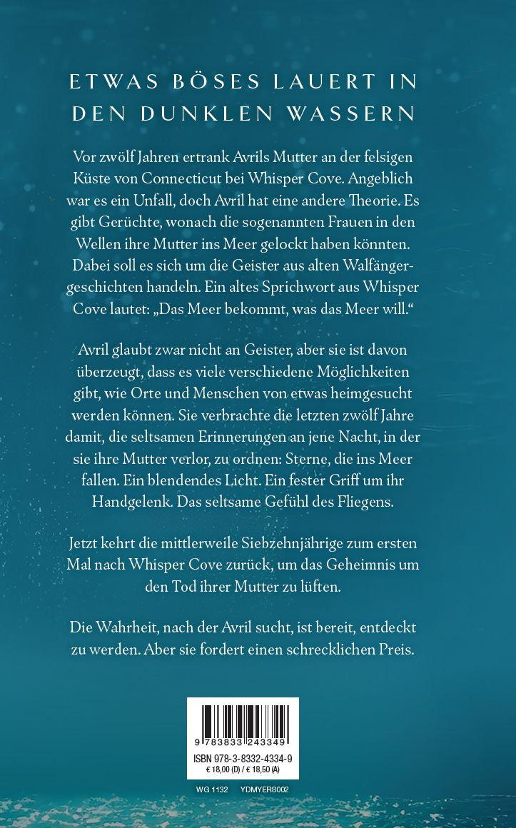 Das Wasser schwappt mir um die Ohren, aber irgendwie höre ich Rufe. Keine Stimmen aus der Erinnerung. Echte Stimmen. Gedämpfte Worte mit einem Hauch von Panik. »Avril!« Es ist Jude. »Zu weit draußen!« Dann etwas, das ich nicht verstehe. Gefährlich. Irgendwas Unterströmung. »Komm zurück!« Ich öffne die Augen und lasse meine Füße sinken, sodass ich Wasser trete. Hier ist es so viel tiefer als am Rande. Dunkler. Kälter. Val und Lex winken mir zu, als würden sie einem Flugzeug ein Zeichen geben. Sie fordern mich auf, zu ihnen zu schwimmen. Lex schreit etwas über Haie. Ich drehe mich langsam im Kreis. In einer Richtung sehe ich meine neuen Freunde. Jude, Lex und Val. Das Feuer, das am Strand brennt. Die Lichter des Whisper Cove Theaters leuchten in der Ferne, auf der Spitze des Hügels hinter ihnen. Aber in der anderen Richtung gibt es offenes Wasser. Der Leuchtturm, und dann nur noch Schwarz. Ein glitschiges, nasses Nichts, das ewig anzuhalten scheint. Und eine Sekunde lang weiß ich nicht, in welche Richtung ich schwimmen will. Ich zögere. Ich bin auf der Suche nach jemandem. Ich warte auf sie. In der Hoffnung, dass sie mich finden wird. Ich habe jahrelang nach meiner Mutter gesucht. In Bächen und Flüssen. In schlammigen texanischen Seen. Im bodenlosen Swimmingpool unseres Nachbarn. In der Badewanne. Aber ich habe sie nie gefunden. Oder sie hat mich nie gefunden. Aber hier klappt es bestimmt. Genau an diesem Ort. Dieser Ozean, dunkel und tief. Ich warte. Trete Wasser. Zähle meine Herzschläge. Lasse eine Einladung in die Tiefe ausströmen. Ich bin hier. Ich bin zurückgekommen. Aber da ist nichts. Da ist nie etwas.