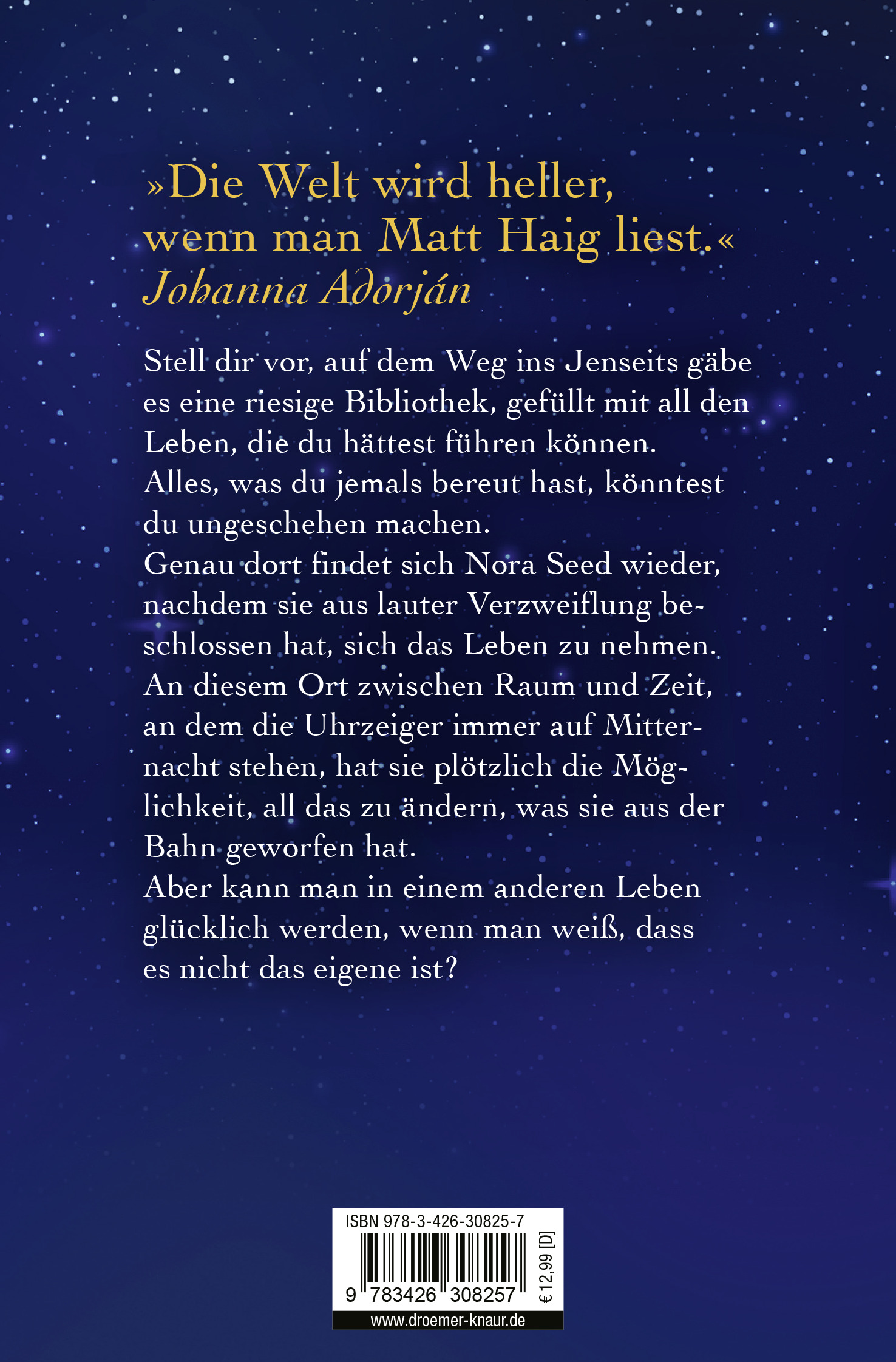 Stell dir vor, auf dem Weg ins Jenseits gäbe es eine riesige Bibliothek, gefüllt mit all den Leben, die du hättest führen können. Alles, was du jemals bereut hast, könntest du ungeschehen machen. Genau dort findet sich Nora Seed wieder, nachdem sie aus lauter Verzweiflung beschlossen hat, sich das Leben zu nehmen. An diesem Ort zwischen Raum und Zeit, an dem die Uhrzeiger immer auf Mitternacht stehen, hat sie plötzlich die Möglichkeit, all das zu ändern, was sie aus der Bahn geworfen hat. Aber kann man in einem anderen Leben glücklich werden, wenn man weiß, dass es nicht das eigene ist?