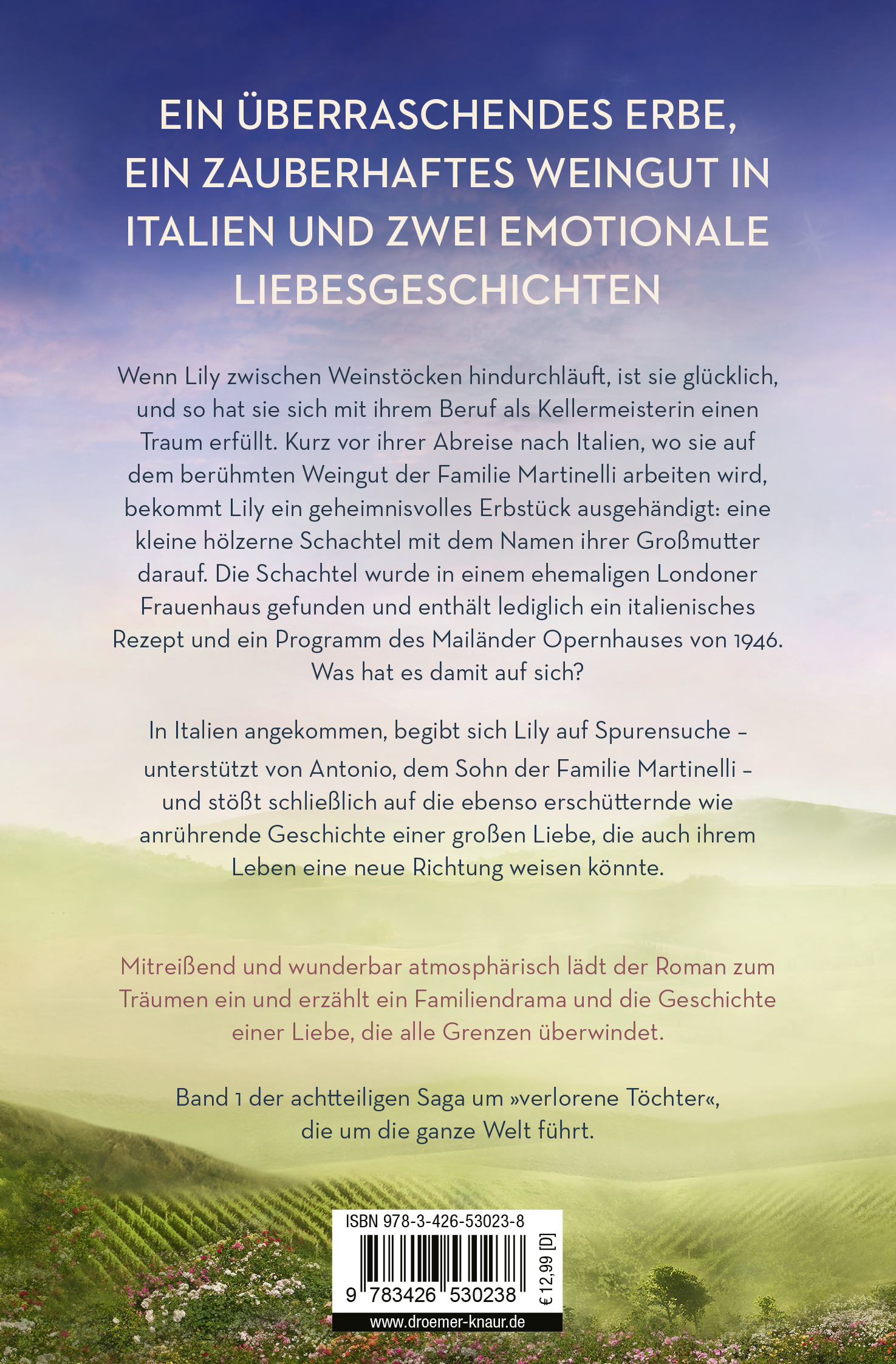 Wenn Lily zwischen Rebstöcken hindurchläuft, ist sie glücklich, und so hat sie sich mit ihrem Beruf als Winzerin einen Traum erfüllt. Kurz vor ihrer Abreise nach Italien, wo sie auf dem berühmten Weingut der Familie Martinelli arbeiten möchte, wird Lily ein geheimnisvolles Erbstück ausgehändigt: Eine kleine hölzerne Schachtel mit dem Namen ihrer Großmutter darauf. Die Schachtel wurde in einem ehemaligen Londoner Frauenhaus gefunden, und sie enthält lediglich ein handgeschriebenes Rezept auf Italienisch und ein Programm des Mailänder Opernhauses von 1946. Was hat es damit auf sich?