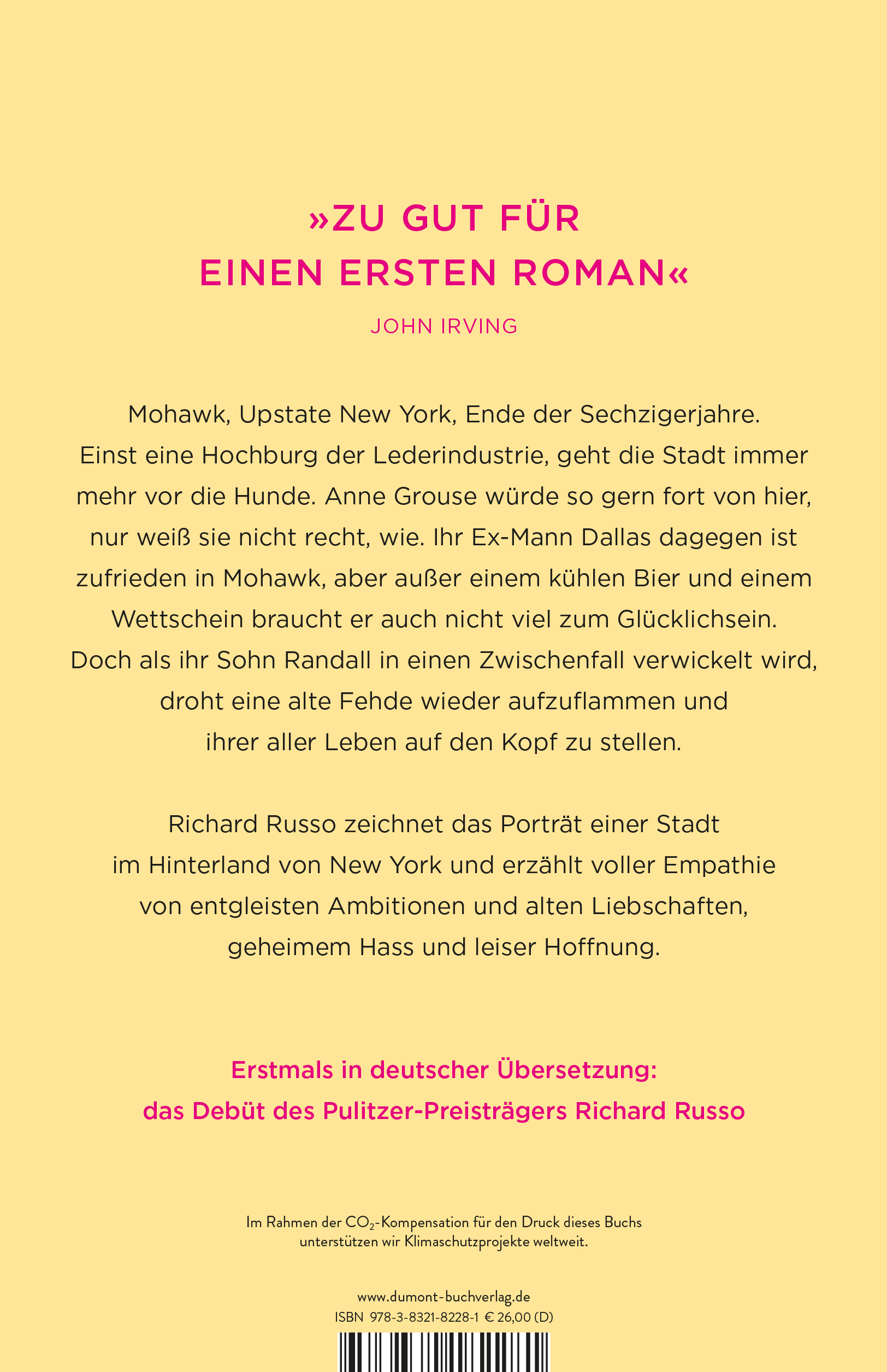 RICHARD RUSSO, 1949 in Johnstown, New York, studierte Philosophie und Creative Writing und lehrte an verschiedenen amerikanischen Universitäten. Für ›Diese gottverdammten Träume‹ (DuMont 2016) erhielt er 2002 den Pulitzer-Preis. Bei DuMont erschienen außerdem ›Diese alte Sehnsucht‹ (2010), ›Ein grundzufriedener Mann‹ und ›Ein Mann der Tat‹ (beide 2017), sowie der Erzählband ›Immergleiche Wege‹ (2018), der SPIEGEL-Bestseller ›Jenseits der Erwartungen‹ (2020), ›Sh*tshow‹ (2020) und zuletzt ›Mittel