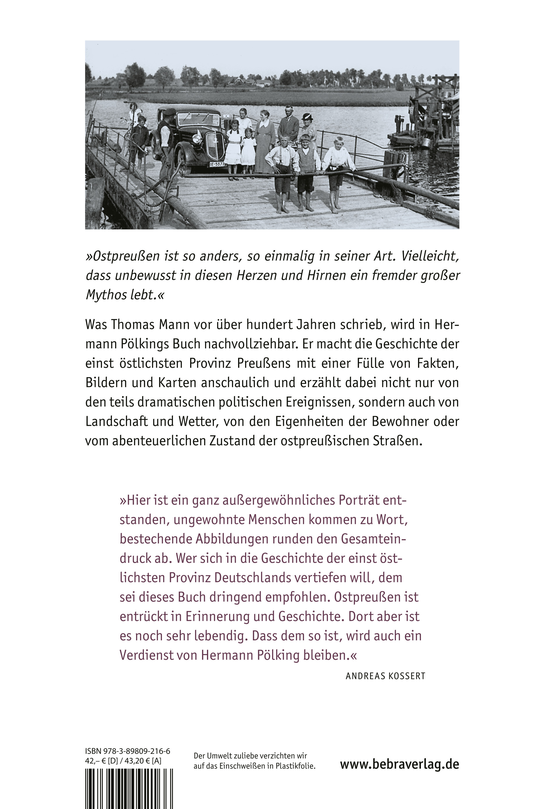 »Ostpreußen ist so anders, so einmalig in seiner Art. Vielleicht, dass unbewusst in diesen Herzen und Hirnen ein fremder großer Mythos lebt.«Was Thomas Mann vor über hundert Jahren schrieb, wird in Hermann Pölkings Buch nachvollziehbar. Er macht die Geschichte der einst östlichsten Provinz Preußens mit einer Fülle von Fakten, Bildern und Karten anschaulich und erzählt dabei nicht nur von den teils dramatischen politischen Ereignissen, sondern auch von Landschaft und Wetter, von den Eigenheiten der Bewohner oder vom abenteuerlichen Zustand der ostpreußischen Straßen.»Hier ist ein ganz außergewöhnliches Porträt entstanden, ungewohnte Menschen kommen zu Wort, bestechende Abbildungen runden den Gesamteindruck ab. Wer sich in die Geschichte der einst östlichsten Provinz Deutschlands vertiefen will, dem sei dieses Buch dringend empfohlen. Ostpreußen ist entrückt in Erinnerung und Geschichte. Dort aber ist es noch sehr lebendig. Dass dem so ist, wird auch ein Verdienst von Hermann Pölking bleiben.«ANDREAS KOSSERT