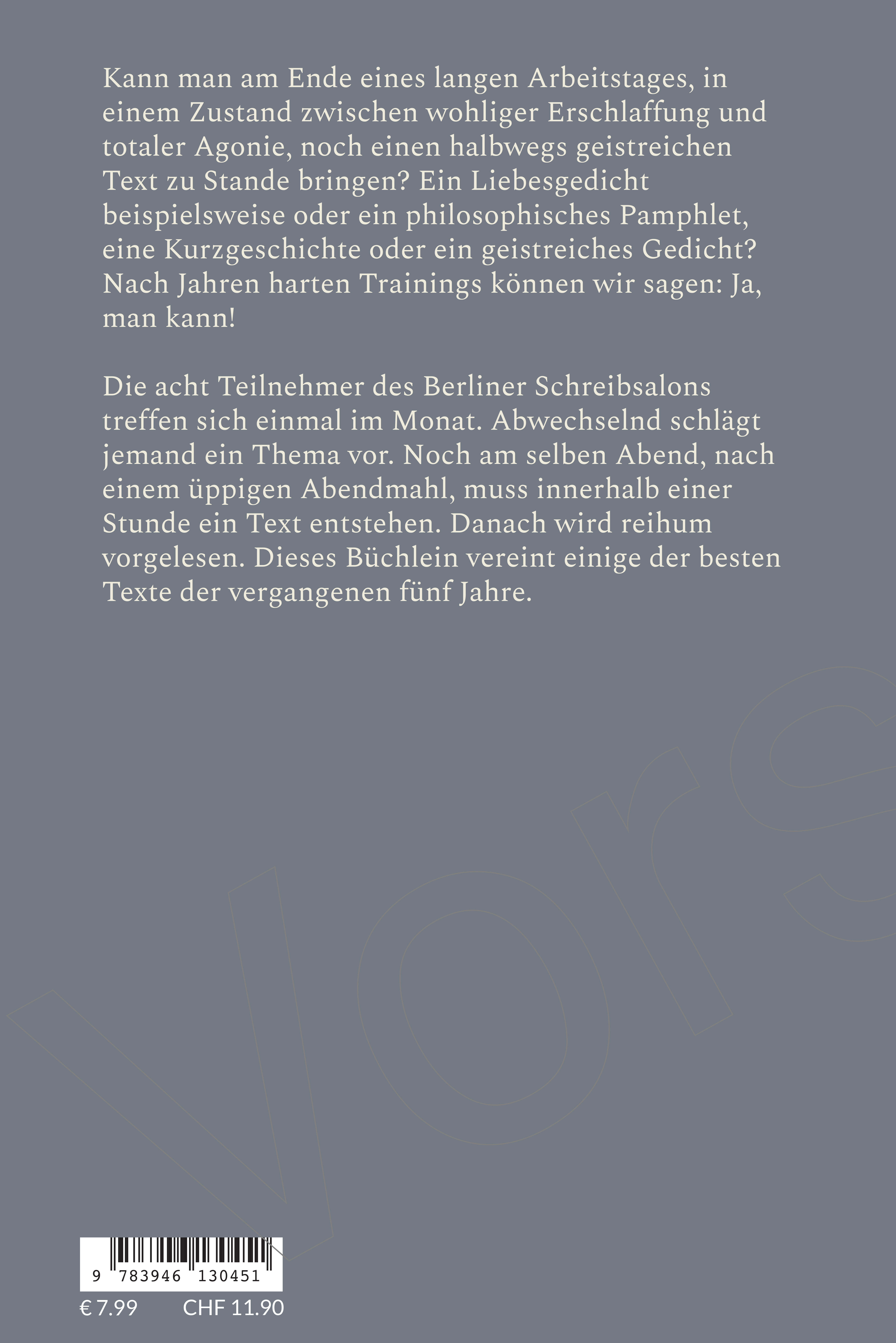 Die acht Teilnehmer des Berliner Schreibsalons treffen sich einmal im Monat. Abwechselnd schlägt jemand ein Thema vor. Noch am selben Abend, nach einem üppigen Abendmahl, muss innerhalb einer Stunde ein Text entstehen. Danach wird reihum vorgelesen. Dieses Büchlein vereint einige der besten Texte der vergangenen fünf Jahre.