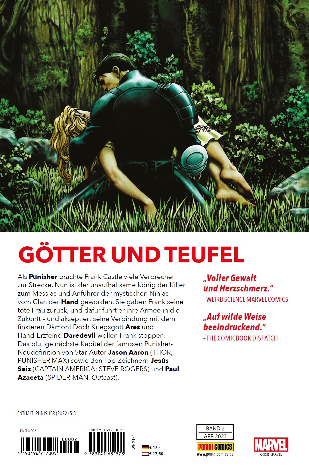 GÖTTER UND TEUFELAls Punisher brachte Frank Castle viele Verbrecher zur Strecke. Nun ist der unaufhaltsame König der Killer zum Messias und Anführer der mystischen Ninjas vom Clan der Hand geworden. Sie gaben Frank seine tote Frau zurück, und dafür führt er ihre Armee in die Zukunft - und akzeptiert seine Verbindung mit dem finsteren Dämon! Doch Kriegsgott Ares und Hand-Erzfeind Daredevil wollen Frank stoppen. Das blutige nächste Kapitel der famosen Punisher-Neudefinition von Star-Autor Jason Aaron (THOR, PUNISHER MAX) sowie den Top-Zeichnern Jesús Saiz (CAPTAIN AMERICA: STEVE ROGERS) und Paul Azaceta (SPIDER-MAN, Outcast).ENTHÄLT: PUNISHER (2022) 5-8