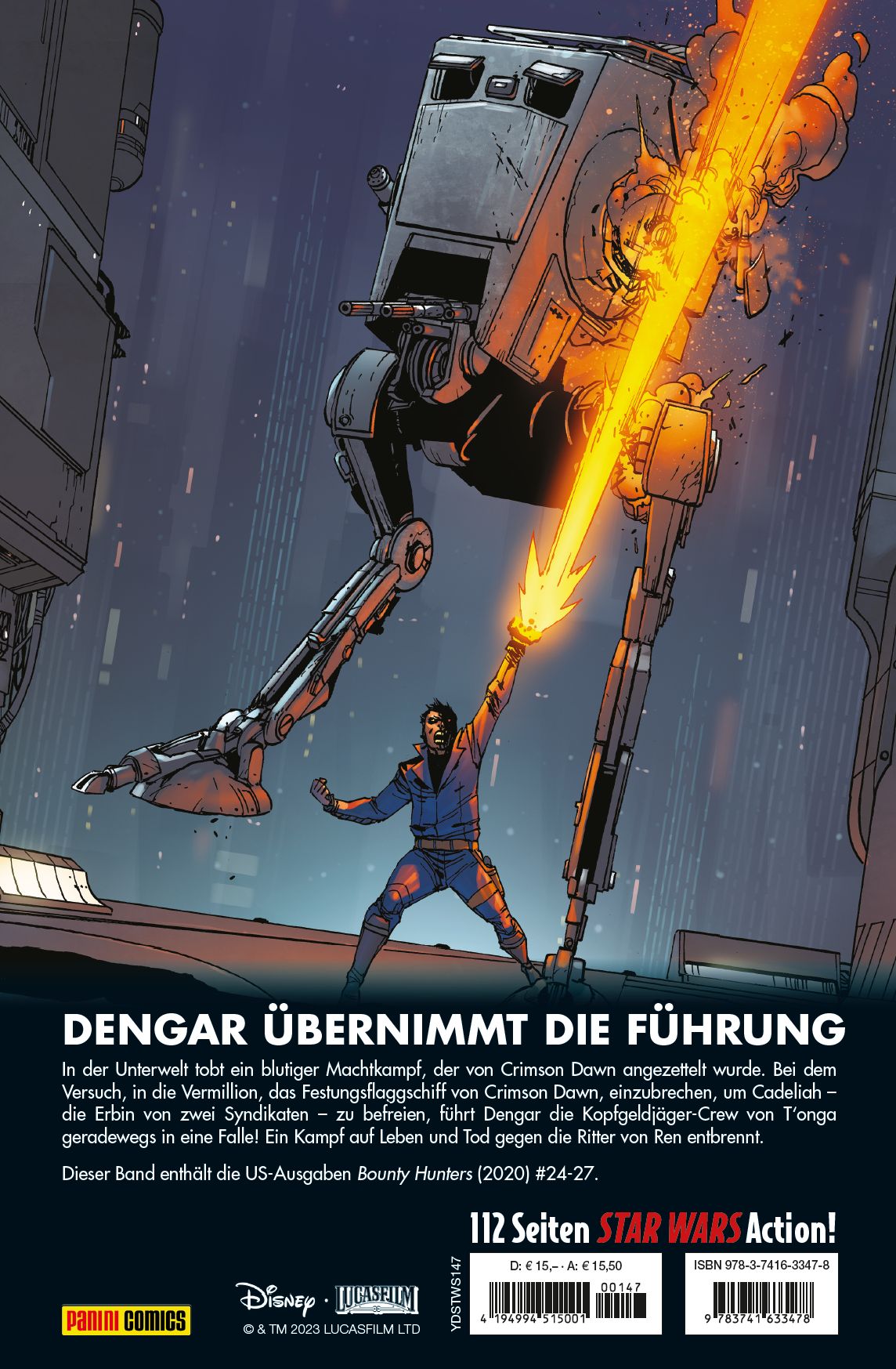 DENGAR ÜBERNIMMT DIE FÜHRUNGIn der Unterwelt tobt ein blutiger Machtkampf, der von Crimson Dawn angezettelt wurde. Bei dem Versuch, in die Vermillion, das Festungsflaggschiff von Crimson Dawn, einzubrechen, um Cadeliah - die Erbin von zwei Syndikaten - zu befreien, führt Dengar die Kopfgeldjäger-Crew von T'onga geradewegs in eine Falle! Ein Kampf auf Leben und Tod gegen die Ritter von Ren entbrennt.Dieser Band enthält die US-Ausgaben Bounty Hunters (2020) #24-27.