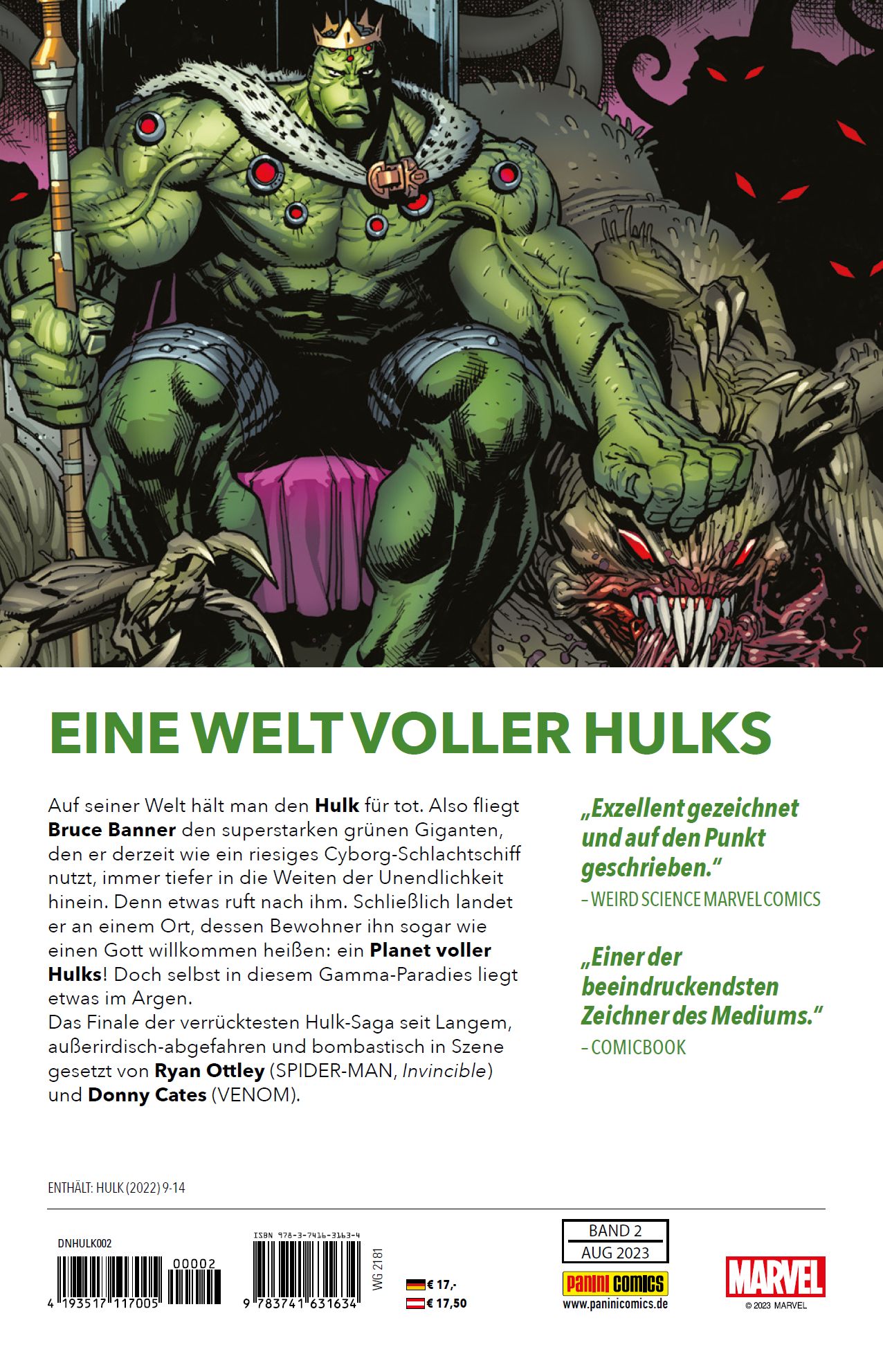EINE WELT VOLLER HULKS Auf seiner Welt hält man den Hulk für tot. Also fliegt Bruce Banner den superstarken grünen Giganten, den er derzeit wie ein riesiges Cyborg-Schlachtschiff nutzt, immer tiefer in die Weiten der Unendlichkeit hinein. Denn etwas ruft nach ihm. Schließlich landet er an einem Ort, dessen Bewohner ihn sogar wie einen Gott willkommen heißen: ein Planet voller Hulks! Doch selbst in diesem Gamma-Paradies liegt etwas im Argen. Das Finale der verrücktesten Hulk-Saga seit Langem, außerirdisch-abgefahren und bombastisch in Szene gesetzt von Ryan Ottley (SPIDER-MAN, Invincible) und Donny Cates (VENOM). ENTHÄLT: HULK (2022) 9-14