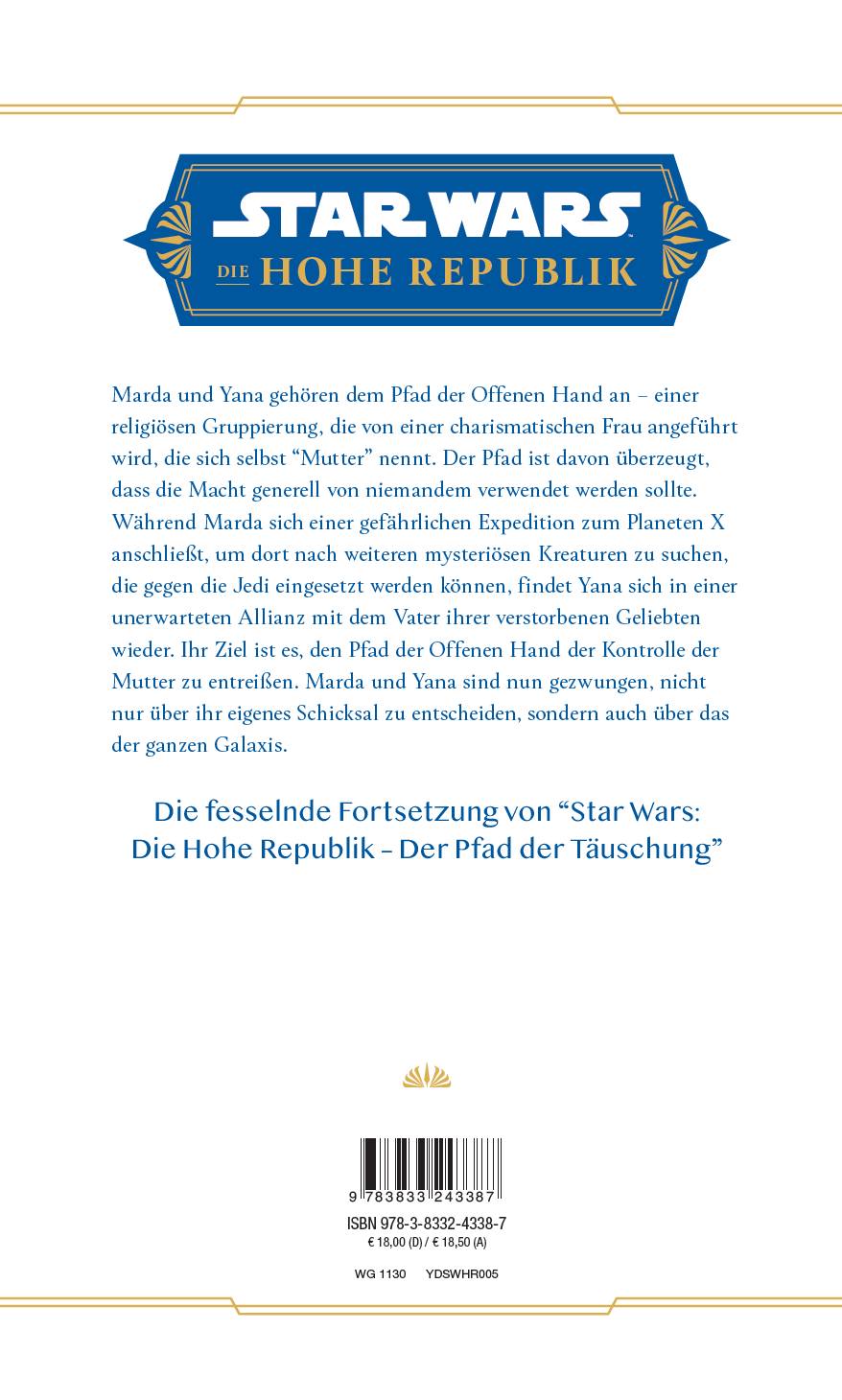 Marda und Yana gehören dem Pfad der Offenen Hand an - einer religiösen Gruppierung, die von einer charismatischen Frau angeführt wird, die sich selbst "Mutter" nennt. Der Pfad ist davon überzeugt, dass die Macht generell von niemandem verwendet werden sollte. Während Marda sich einer gefährlichen Expedition zum Planeten X anschließt, um dort nach weiteren mysteriösen Kreaturen zu suchen, die gegen die Jedi eingesetzt werden können, findet Yana sich in einer unerwarteten Allianz mit dem Vater ihrer verstorbenen Geliebten wieder. Ihr Ziel ist es, den Pfad der Offenen Hand der Kontrolle der Mutter zu entreißen. Marda und Yana sind nun gezwungen, nicht nur über ihr eigenes Schicksal zu entscheiden, sondern auch über das der ganzen Galaxis.Die fesselnde Fortsetzung von "Star Wars: Die Hohe Republik - Der Pfad der Täuschung"