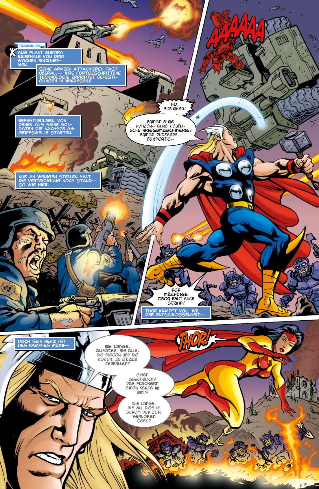 GEBOREN ZU EROBERN von Thomas Witzler Sein Leben lang hat Kang der Eroberer Ressourcen und Technologien der Zukunft genutzt, um über möglichst viele Universen zu herrschen. Besonders die Erde mit ihren zahlreichen Superhelden vereitelte oft seine Pläne. Aber als Zeitreisender hat Kang alle Zeit der Welt. Sein Alter Ego Nathaniel Richards kam auf Erde-6311 zur Welt, eine alternative Realität, die nie ein dunkles Mittelalter erlebte. Dadurch schritt die technische Entwicklung viel schneller voran als auf der allseits bekannten Erde-616 des Marvel-Kosmos. Bereits 900 n. Chr. erfolgte die erste Mondlandung. Dieser Meilenstein wurde als erstes Jahr eines neuen Kalenders bestimmt. Doch ein großer Krieg, der den Mond und seine lunare Kolonie zerstörte, warf den Planeten um Jahrhunderte zurück. Nathaniel Richards von Erde-616, der Vater von Mr. Fantastic, landete im Zuge einer Zeitreise auf dem verwüsteten Stern, ließ sich nieder, brachte Frieden, half beim Wiederaufbau und heiratete eine einheimische Anführerin. Aufgrund seiner Taten wurde er Benefactor genannt. Im Jahr 3000 wurde sein berüchtigter Nachkomme und Namenspatron geboren. Der künftige Kang entwickelte bereits als 16-jähriger Student einen Androiden, der kinetische Energie in Wachstum umsetzte. Nachdem ihm ein Rowdy die Kehle aufgeschlitzt hatte, verbrachte Nathaniel ein Jahr im Hospital. Im Krankenbett studierte er Berichte über die Heldenära von Erde-616, die ihn nicht mehr losließ. Mit 25 Jahren entdeckte er die Zitadelle von Benefactor samt Zeitmaschine. Es war die Geburtsstunde des Eroberers. Zuerst unterwarf er das 4. Jahrtausend seiner Erde und dann ganze Imperien der Galaxie. Neben den Avengers und F4 war Kang selbst stets sein größter Feind. Unentwegt versuchte er, die Zukunft zu verhindern oder die Vergangenheit zu annullieren. Dadurch schuf er unabsichtlich zig Versionen von sich, die seine Welteroberungspläne durchkreuzten, darunter Immortus, Rama-Tut, Scarlet Centurion oder Young Avenger Iron Lad. Nun tauchte er mit seinem Sohn Marcus Kang XXIII, dem neuen Scarlet Centurion, in der Realität von Erde-616 auf und erklärte den Vereinten Nationen den Krieg. Als die Avengers eine Kapitulation verweigerten, zerstörte Kang das Gebäude der UN in New York. Ein Kraftfeld schützte die Insassen. Anschließend zeigte er der Menschheit fatale Zukunftsszenarien und prophezeite ein ähnliches Schicksal, um mögliche Verbündete zu mobilisieren. Attuma von Atlantis, der Russe Presence und abtrünnige Deviants schlugen sich auf die Seite des Tyrannen. Die UN entschied sich zur Gegenwehr. Kang kündigte an, Frankreich zu attackieren und warnte vor einem Direktangriff auf seine Person. Die Avengers kämpften an allen Fronten gegen Attumas Horden, Deviants, Wizard, AIM und andere Bedrohungen. Doch die USA drängten sie, Kang innerhalb von 96 Stunden zu Fall zu bringen. Andernfalls würden sie das Raumschiff des Aggressors selbst mit einer Flotte Sentinels bekriegen. Zu alledem mischte sich auch noch der Herr der Welt in den Konflikt ein und errichtete weltweit Verteidigungswälle um größere Städte. Während Warbird von Marcus überraschend Hilfe erhielt, teilten sich die Avengers in drei Gruppen auf: Ein Team verteidigte Frankreich, das zweite nahm sich den Herrn der Welt vor und das dritte konfrontierte Kang …