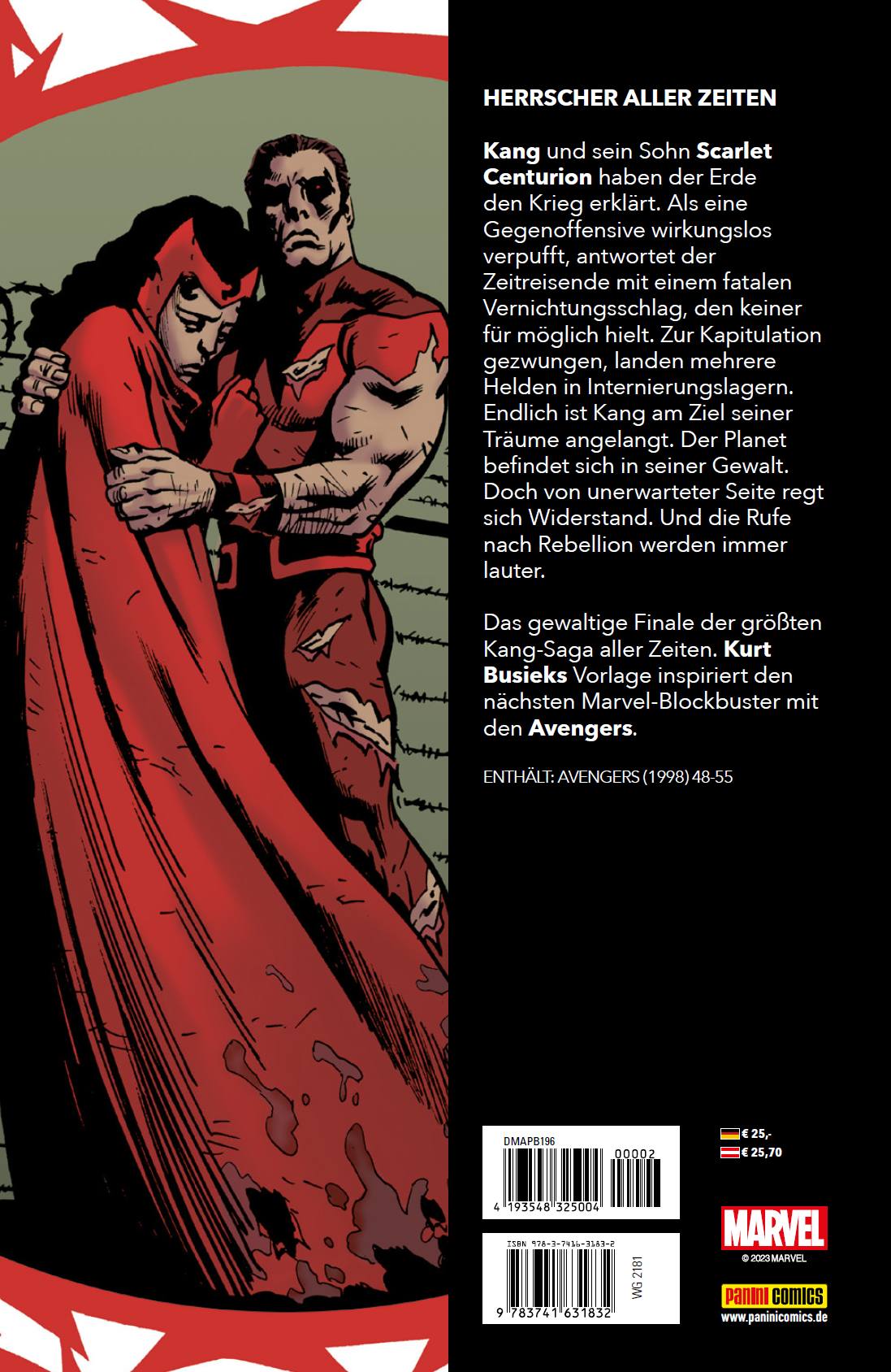 HERRSCHER ALLER ZEITEN Kang und sein Sohn Scarlet Centurion haben der Erde den Krieg erklärt. Als eine Gegenoffensive wirkungslos verpufft, antwortet der Zeitreisende mit einem fatalen Vernichtungsschlag, den keiner für möglich hielt. Zur Kapitulation gezwungen, landen mehrere Helden in Internierungslagern. Endlich ist Kang am Ziel seiner Träume angelangt. Der Planet befindet sich in seiner Gewalt. Doch von unerwarteter Seite regt sich Widerstand. Und die Rufe nach Rebellion werden immer lauter. Das gewaltige Finale der größten Kang-Saga aller Zeiten. Kurt Busieks Vorlage inspiriert den nächsten Marvel-Blockbuster mit den Avengers. ENTHÄLT: AVENGERS (1998) 48-55 DMAPB196
