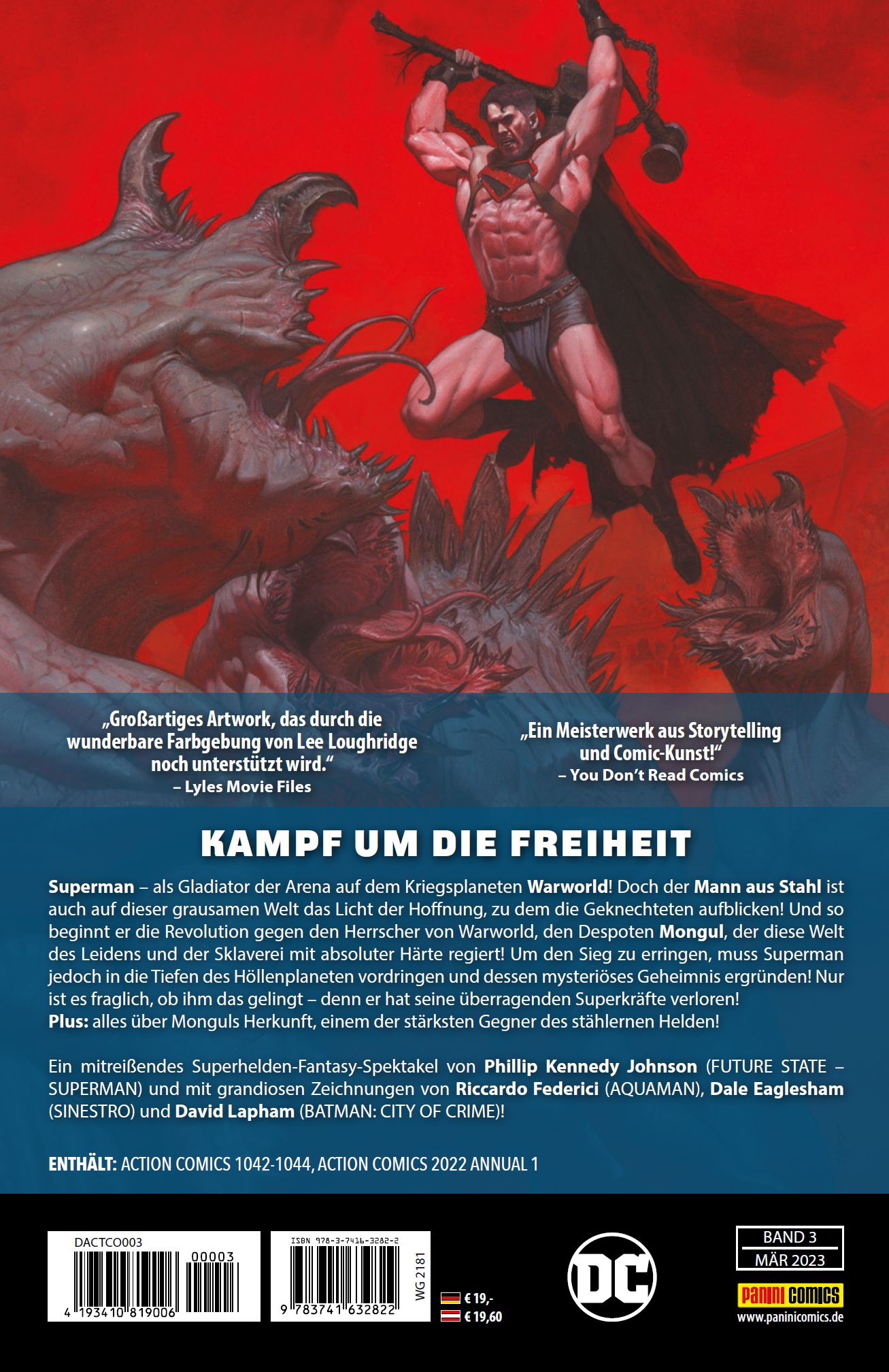 KAMPF UM DIE FREIHEITSuperman - als Gladiator der Arena auf dem Kriegsplaneten Warworld! Doch der Mann aus Stahl ist auch auf dieser grausamen Welt das Licht der Hoffnung, zu dem die Geknechteten aufblicken! Und so beginnt er die Revolution gegen den Herrscher von Warworld, den Despoten Mongul, der diese Welt des Leidens und der Sklaverei mit absoluter Härte regiert! Um den Sieg zu erringen, muss Superman jedoch in die Tiefen des Höllenplaneten vordringen und dessen mysteriöses Geheimnis ergründen! Nur ist es fraglich, ob ihm das gelingt - denn er hat seine überragenden Superkräfte verloren! Plus: alles über Monguls Herkunft, einem der stärksten Gegner des stählernen Helden!Ein mitreißendes Superhelden-Fantasy-Spektakel von Phillip Kennedy Johnson (FUTURE STATE - SUPERMAN) und mit grandiosen Zeichnungen von Riccardo Federici (AQUAMAN), Dale Eaglesham (SINESTRO) und David Lapham (BATMAN: CITY OF CRIME)!ENTHÄLT: ACTION COMICS 1042-1044, ACTION COMICS 2022 ANNUAL 1