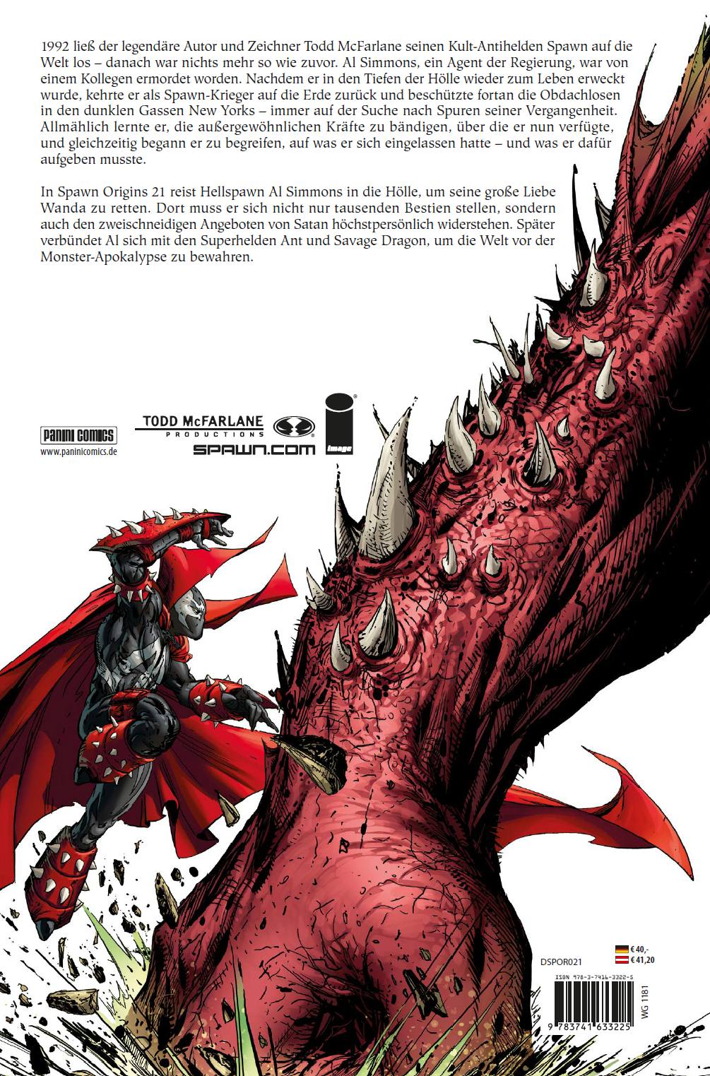 1992 ließ der legendäre Autor und Zeichner Todd McFarlane seinen Kult-Antihelden Spawn auf die Welt los - danach war nichts mehr so wie zuvor. Al Simmons, ein Agent der Regierung, war von einem Kollegen ermordet worden. Nachdem er in den Tiefen der Hölle wieder zum Leben erweckt wurde, kehrte er als Spawn-Krieger auf die Erde zurück und beschützte fortan die Obdachlosen in den dunklen Gassen New Yorks - immer auf der Suche nach Spuren seiner Vergangenheit. Allmählich lernte er, die außergewöhnlichen Kräfte zu bändigen, über die er nun verfügte, und gleichzeitig begann er zu begreifen, auf was er sich eingelassen hatte - und was er dafür aufgeben musste. In Spawn Origins 21 reist Hellspawn Al Simmons in die Hölle, um seine große Liebe Wanda zu retten. Dort muss er sich nicht nur tausenden Bestien stellen, sondern auch den zweischneidigen Angeboten von Satan höchstpersönlich widerstehen. Später verbündet Al sich mit den Superhelden Ant und Savage Dragon, um die Welt vor der Monster-Apokalypse zu bewahren.