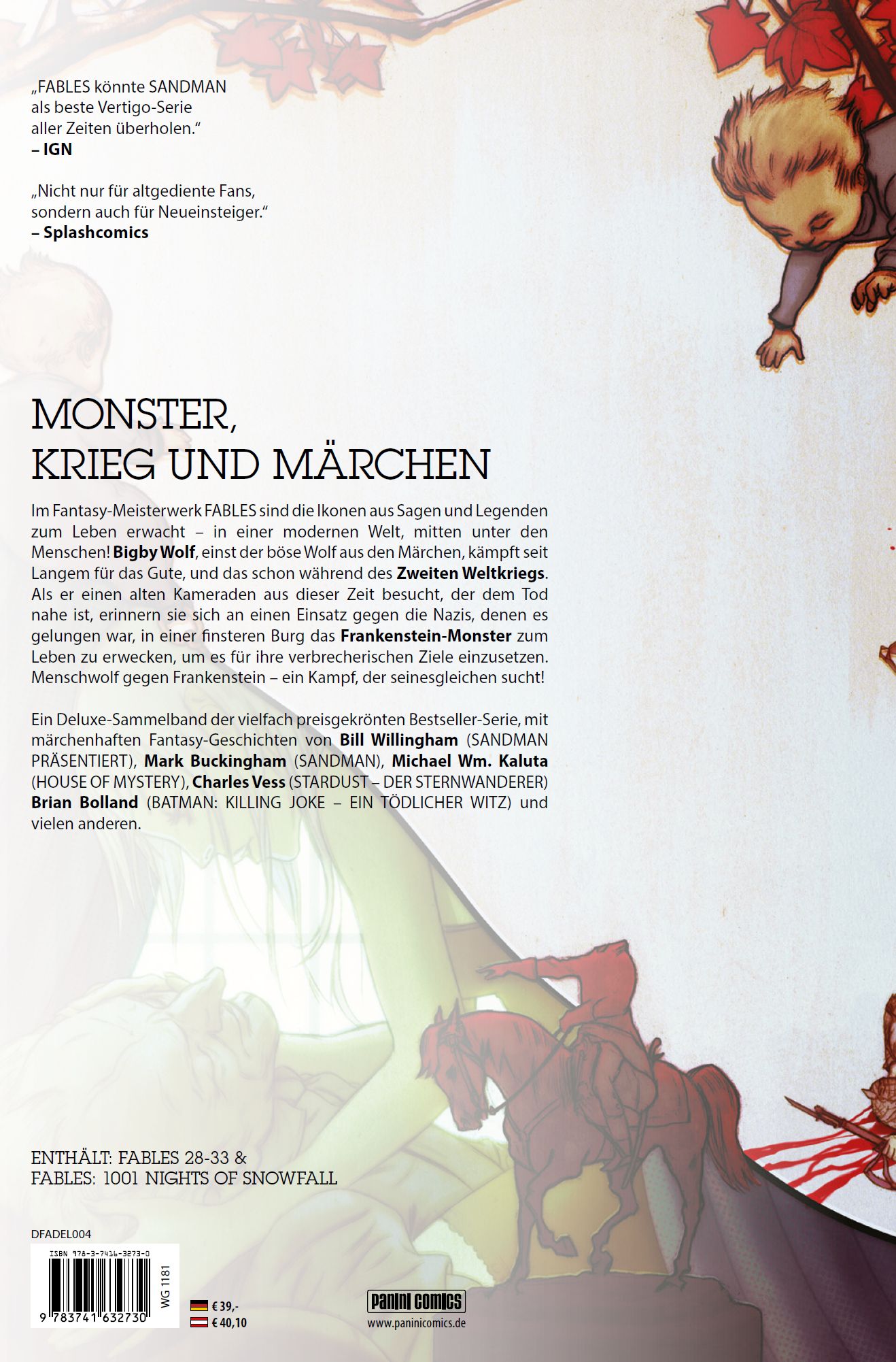 MONSTER, KRIEG UND MÄRCHEN Im Fantasy-Meisterwerk FABLES sind die Ikonen aus Sagen und Legenden zum Leben erwacht - in einer modernen Welt, mitten unter den Menschen! Bigby Wolf, einst der böse Wolf aus den Märchen, kämpft seit Langem für das Gute, und das schon während des Zweiten Weltkriegs. Als er einen alten Kameraden aus dieser Zeit besucht, der dem Tod nahe ist, erinnern sie sich an einen Einsatz gegen die Nazis, denen es gelungen war, in einer finsteren Burg das Frankenstein-Monster zum Leben zu erwecken, um es für ihre verbrecherischen Ziele einzusetzen. Menschwolf gegen Frankenstein - ein Kampf, der seinesgleichen sucht! Ein Deluxe-Sammelband der vielfach preisgekrönten Bestseller-Serie, mit märchenhaften Fantasy-Geschichten von Bill Willingham (SANDMAN PRÄSENTIERT), Mark Buckingham (SANDMAN), Michael Wm. Kaluta (HOUSE OF MYSTERY), Charles Vess (STARDUST - DER STERNWANDERER) Brian Bolland (BATMAN: KILLING JOKE - EIN TÖDLICHER WITZ) und vielen anderen. ENTHÄLT: FABLES 28-33 & FABLES: 1001 NIGHTS OF SNOWFALL