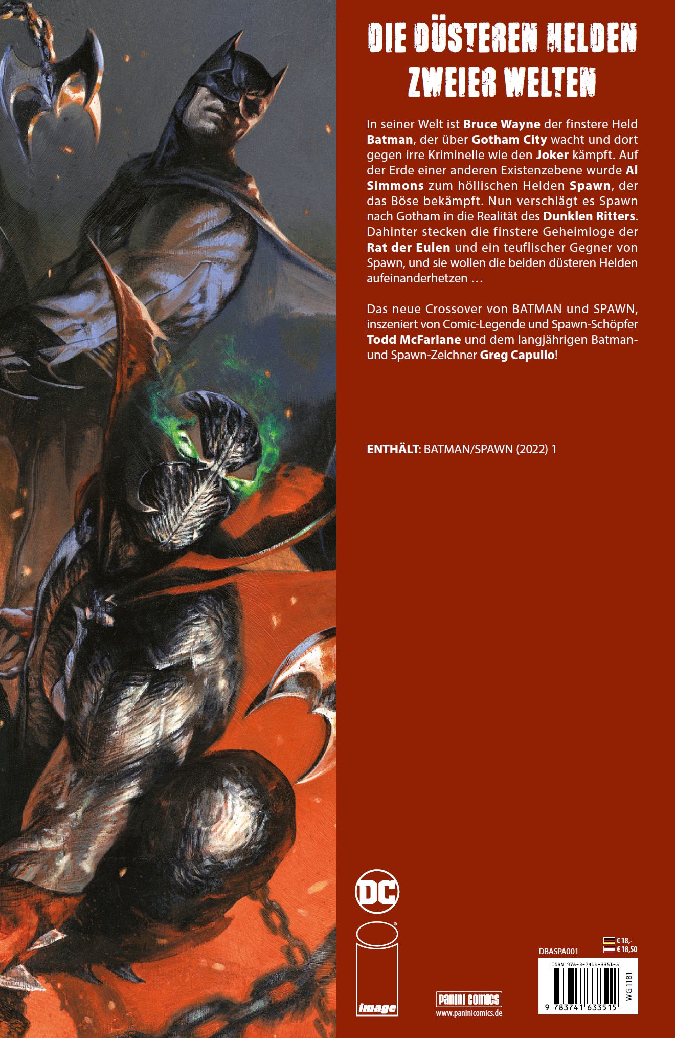 DIE DÜSTEREN HELDEN ZWEIER WELTENIn seiner Welt ist Bruce Wayne der finstere Held Batman, der über Gotham City wacht und dort gegen irre Kriminelle wie den Joker kämpft. Auf der Erde einer anderen Existenzebene wurde Al Simmons zum höllischen Helden Spawn, der das Böse bekämpft. Nun verschlägt es Spawn nach Gotham in die Realität des Dunklen Ritters. Dahinter stecken die finstere Geheimloge der Rat der Eulen und ein teuflischer Gegner von Spawn, und sie wollen die beiden düsteren Helden aufeinanderhetzen...Das neue Crossover von BATMAN und SPAWN, inszeniert von Comic-Legende und Spawn-Schöpfer Todd McFarlane und dem langjährigen Batman- und Spawn-Zeichner Greg Capullo!ENTHÄLT: BATMAN/SPAWN (2022) 1