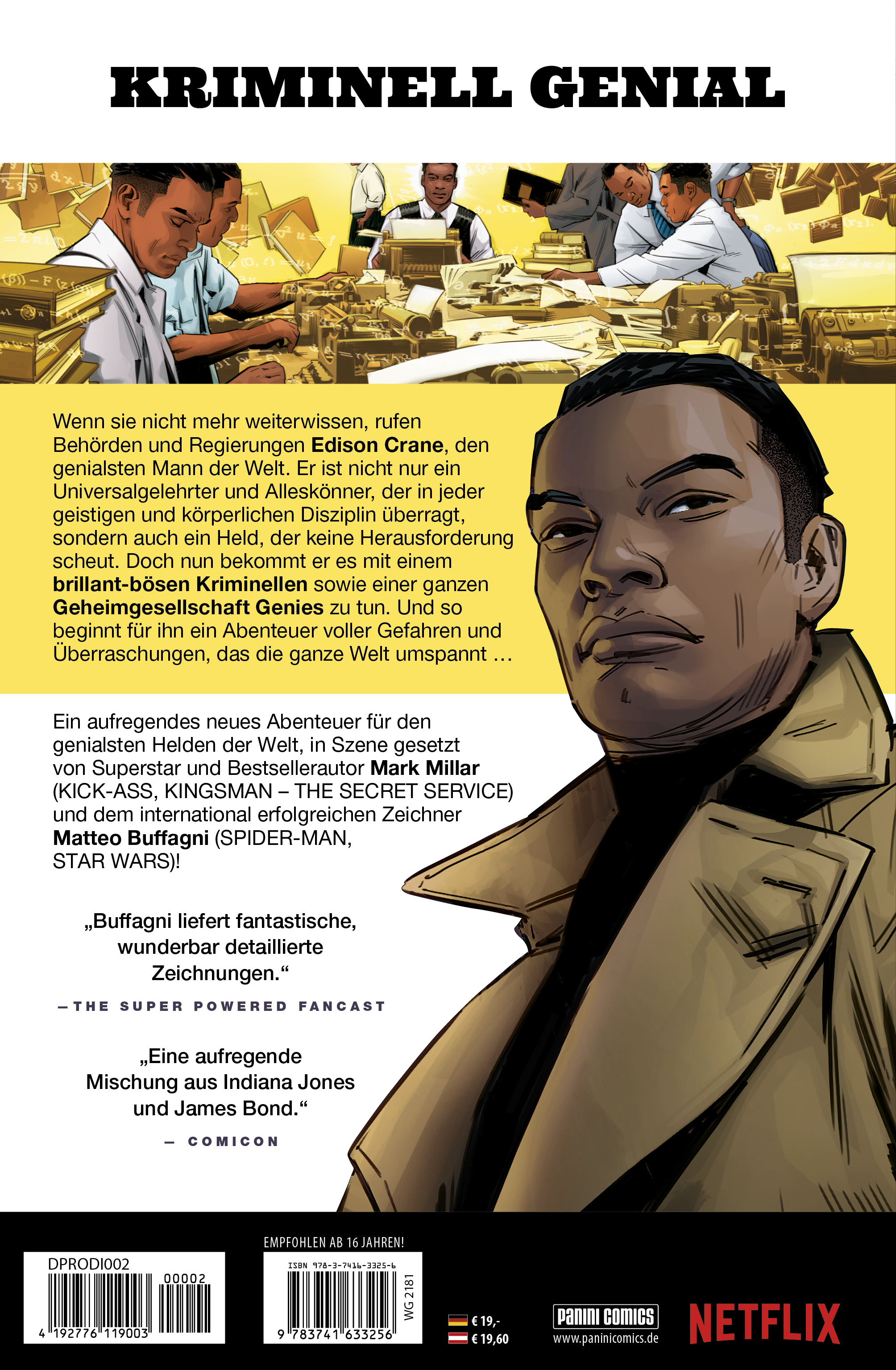 KRIMINELL GENIAL Wenn sie nicht mehr weiterwissen, rufen Behörden und Regierungen Edison Crane, den genialsten Mann der Welt. Er ist nicht nur ein Universalgelehrter und Alleskönner, der in jeder geistigen und körperlichen Disziplin überragt, sondern auch ein Held, der keine Herausforderung scheut. Doch nun bekommt er es mit einem brillant-bösen Kriminellen sowie einer ganzen Geheimgesellschaft Genies zu tun. Und so beginnt für ihn ein Abenteuer voller Gefahren und Überraschungen, das die ganze Welt umspannt ... Ein aufregendes neues Abenteuer für den genialsten Helden der Welt, in Szene gesetzt von Superstar und Bestsellerautor Mark Millar (KICK-ASS, KINGSMAN - THE SECRET SERVICE) und dem international erfolgreichen Zeichner Matteo Buffagni (SPIDER-MAN, STAR WARS)!