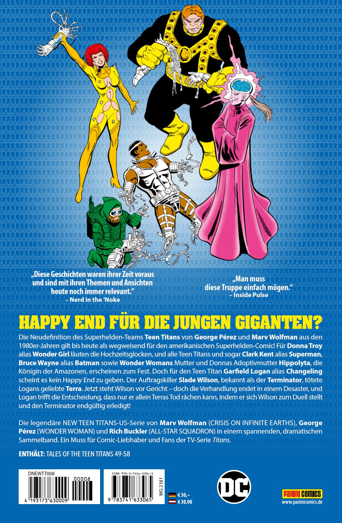 HAPPY END FÜR DIE JUNGEN GIGANTEN?Die Neudefinition des Superhelden-Teams Teen Titans von George Pérez und Marv Wolfman aus den 1980er-Jahren gilt bis heute als wegweisend für den amerikanischen Superhelden-Comic! Für Donna Troy alias Wonder Girl läuten die Hochzeitsglocken, und alle Teen Titans und sogar Clark Kent alias Superman, Bruce Wayne alias Batman und Wonder Womans Mutter Hippolyta, die Königin der Amazonen, erscheinen zum Fest. Doch für den Teen Titan Garfield Logan alias Changeling scheint es kein Happy End zu geben. Der Auftragskiller Slade Wilson, bekannt als der Terminator, tötete Logans geliebte Terra. Jetzt steht Wilson vor Gericht - doch die Verhandlung endet in einem Desaster, und Logan trifft die Entscheidung, dass nur er allein Terras Tod rächen kann, indem er sich Wilson zum Duell stellt und den Terminator endgültig erledigt!Die legendäre NEW TEEN TITANS-US-Serie von Marv Wolfman (CRISIS ON INFINITE EARTHS), George Pérez (WONDER WOMAN), Rich Buckler (ALL-STAR SQUADRON) in einem spannenden, dramatischen Sammelband. Ein Muss für Comic-Liebhaber und Fans der TV-Serie Titans.ENTHÄLT: TALES OF THE TEEN TITANS 49-58