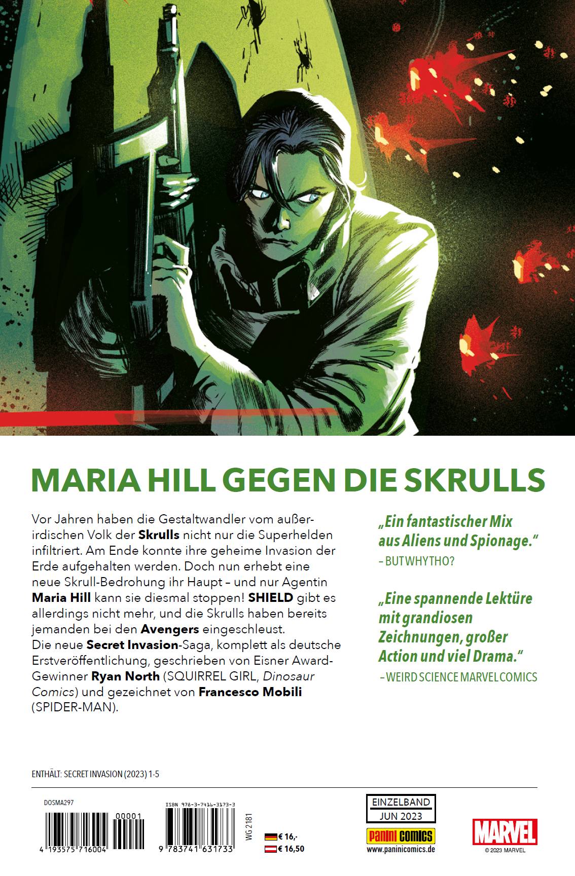 MARIA HILL GEGEN DIE SKRULLS Vor Jahren haben die Gestaltwandler vom außerirdischen Volk der Skrulls nicht nur die Superhelden infi ltriert. Am Ende konnte ihre geheime Invasion der Erde aufgehalten werden. Doch nun erhebt eine neue Skrull-Bedrohung ihr Haupt - und nur Agentin Maria Hill kann sie diesmal stoppen! SHIELD gibt es allerdings nicht mehr, und die Skrulls haben bereits jemanden bei den Avengers eingeschleust. Die neue Secret Invasion-Saga komplett als deutsche Erstveröffentlichung, geschrieben von Eisner Award- Gewinner Ryan North (SQUIRREL GIRL, Dinosaur Comics) und gezeichnet von Francesco Mobili (SPIDER-MAN). ENTHÄLT: SECRET INVASION (2023) 1-5