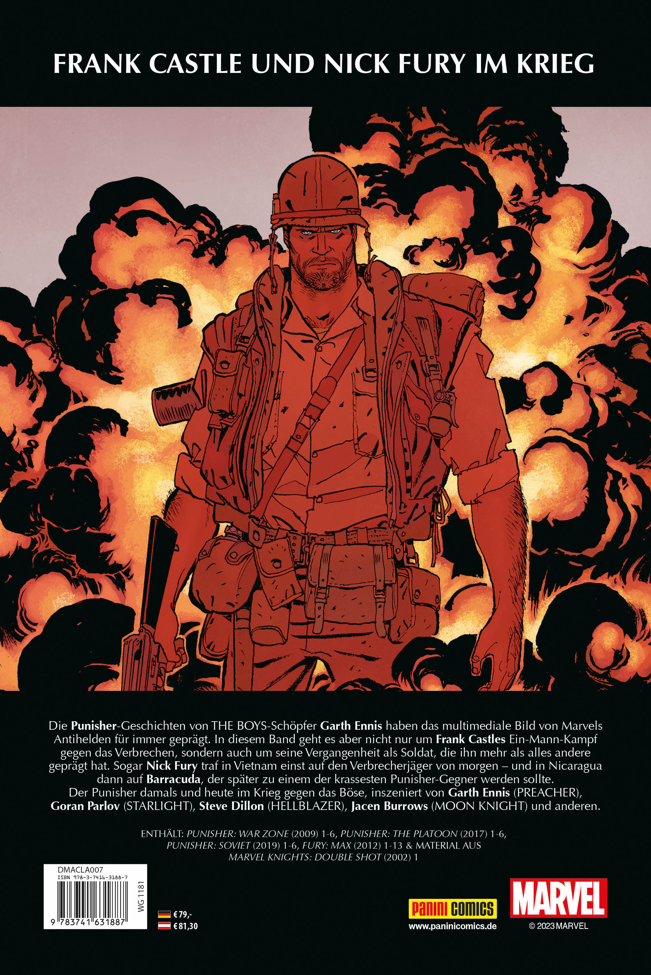 FRANK CASTLE UND NICK FURY IM KRIEG Die Punisher-Geschichten von THE BOYS-Schöpfer Garth Ennis haben das multimediale Bild von Marvels Antihelden für immer geprägt. In diesem Band geht es aber nicht nur um Frank Castles Ein-Mann-Kampf gegen das Verbrechen, sondern auch um seine Vergangenheit als Soldat, die ihn mehr als alles andere geprägt hat. Sogar Nick Fury traf in Vietnam einst auf den Verbrecherjäger von Morgen - und in Nicaragua dann auf Barracuda, der später zu einem der krassesten Punisher-Gegner werden sollte. Der Punisher damals und heute im Krieg gegen das Böse, inszeniert von Garth Ennis (PREACHER), Goran Parlov (STARLIGHT), Steve Dillon (HELLBLAZER), Jacen Burrows (MOON KNIGHT) und anderen.ENTHÄLT: PUNISHER: WAR ZONE (2009) 1-6, PUNISHER: THE PLATOON (2017) 1-6, PUNISHER: SOVIET (2019) 1-6, FURY MAX (2012) 1-13 & MATERIAL AUS MARVEL KNIGHTS: DOUBLE SHOT (2002) 1