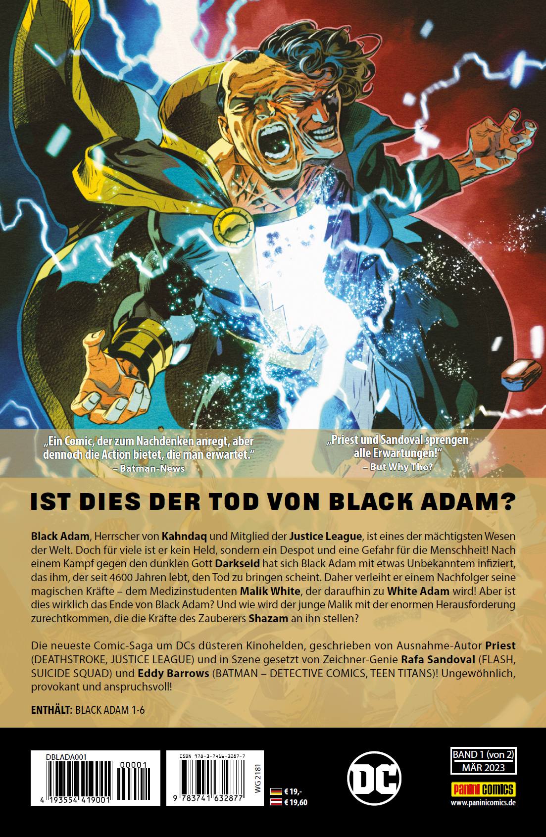 IST DIES DER TOD VON BLACK ADAM?Black Adam, Herrscher von Kahndaq und Mitglied der Justice League, ist eines der mächtigsten Wesen der Welt. Doch für viele ist er kein Held, sondern ein Despot und eine Gefahr für die Menschheit! Nach einem Kampf gegen den dunklen Gott Darkseid hat sich Black Adam mit etwas Unbekannten infiziert, das ihm, der seit 4600 Jahren lebt, den Tod zu bringen scheint. Daher verleiht er einem Nachfolger seine magischen Kräfte - dem Medizinstudenten Malik White, der daraufhin zu White Adam wird! Aber ist dies wirklich das Ende von Black Adam? Und wie wird der junge Malik mit der enormen Herausforderung zurechtkommen, die die Kräfte des Zauberers Shazam an ihn stellen? Die neueste Comic-Saga um DCs düsteren Kinohelden, geschrieben von Ausnahme-Autor Christopher Priest (DEATHSTROKE, JUSTICE LEAGUE) und in Szene gesetzt von Zeichner-Genie Rafa Sandoval (FLASH, SUICIDE SQUAD) und Eddy Barrows (BATMAN - DETECTIVE COMICS, TEEN TITANS)! Ungewöhnlich, provokant und anspruchsvoll! ENTHÄLT: BLACK ADAM 1-6