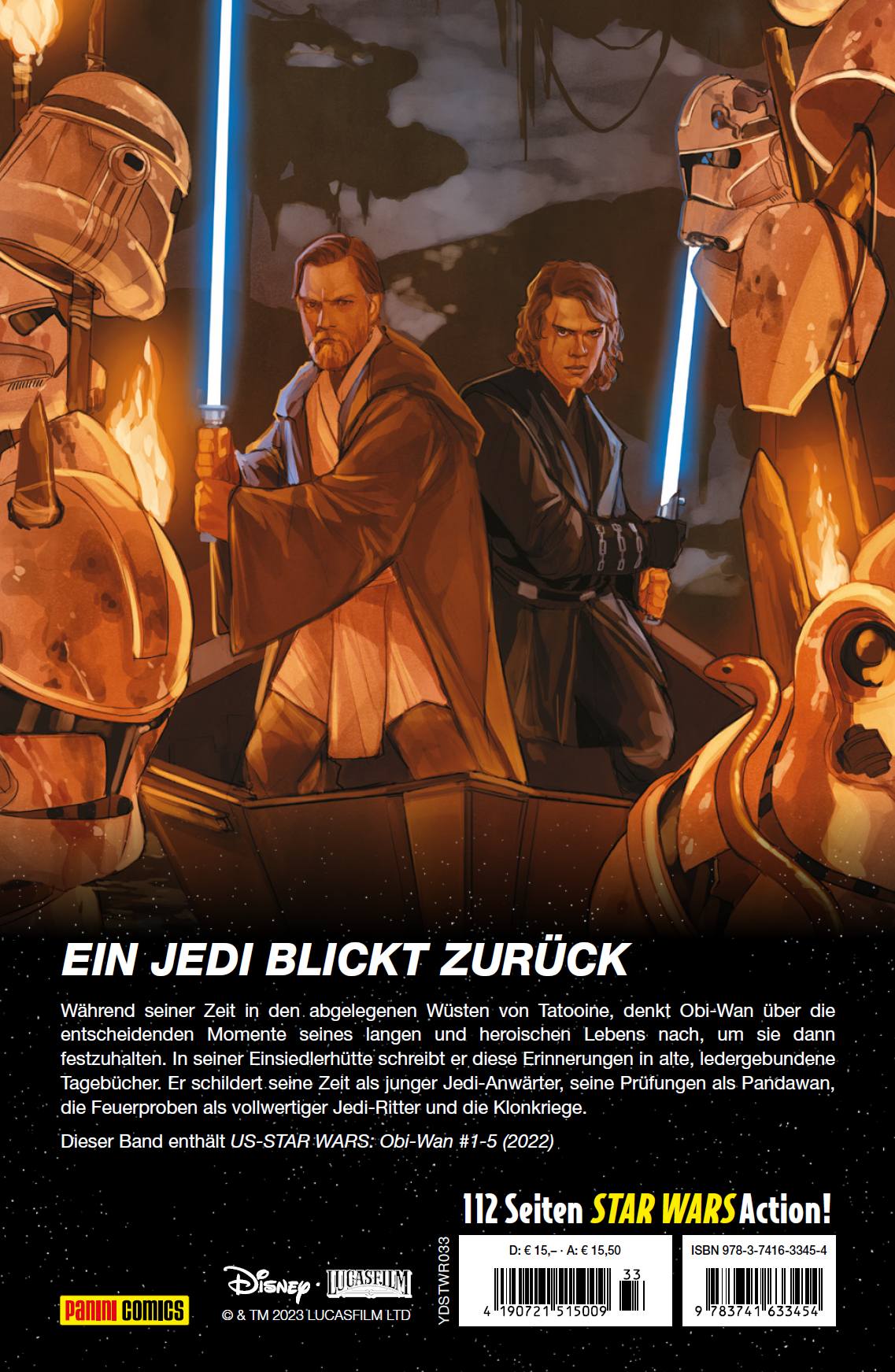 EINLEITUNG In diesem Band werden wir einige neue, unerwartete Dinge über das Leben von Obi-Wan Kenobi erfahren, und das obwohl er einer der beliebtesten Jedi ist und in unzähligen Geschichten (Filmen, TV-Serien, Comics, Romanen) der Saga vorkommt. Wir sind ihm als Qui-Gon Jinns Padawan in Die dunkle Bedrohung begegnet, als Lehrer des jungen Anakin Skywalker in Angriff der Klonkrieger und später an dessen Seite als Kampfgefährte und Freund in Die Rache der Sith, bevor Anakin sich der dunklen Seite zuwendet. In der Zeichentrickserie The Clone Wars begegnen wir ihm als General an der Spitze der Klonarmeen der Republik gegen die Separatisten und schließlich sehen wir ihn als alten Mann, Mentor und Lehrer von Luke Skywalker in Eine neue Hoffnung und danach sogar noch als Machtgeist in Das Imperium schlägt zurück und Die Rückkehr der Jedi-Ritter. Im Mai 2022 startet dann die TV-Serie Obi-Wan Kenobi, die während seines selbstgewählten Exils auf dem Wüstenplaneten Tatooine spielt und unter anderem zeigt, wie er über den jungen Luke wacht - und genau auf diesem Planeten spielt auch die Geschichte dieses Sonderbands.Obi-Wan, mittlerweile gealtert, ist mit dem Schreiben seines Tagebuchs beschäftigt, während er auf den Beginn eines Sandsturms in den abgelegenen Wüsten von Tatooine wartet. Er lässt Schlüsselmomente seines heldenhaften Lebens an seinem geistigen Auge vorbeiziehen, um sie aufzuschreiben und darüber nachzudenken, was die wahre Bestimmung eines Jedi ist.