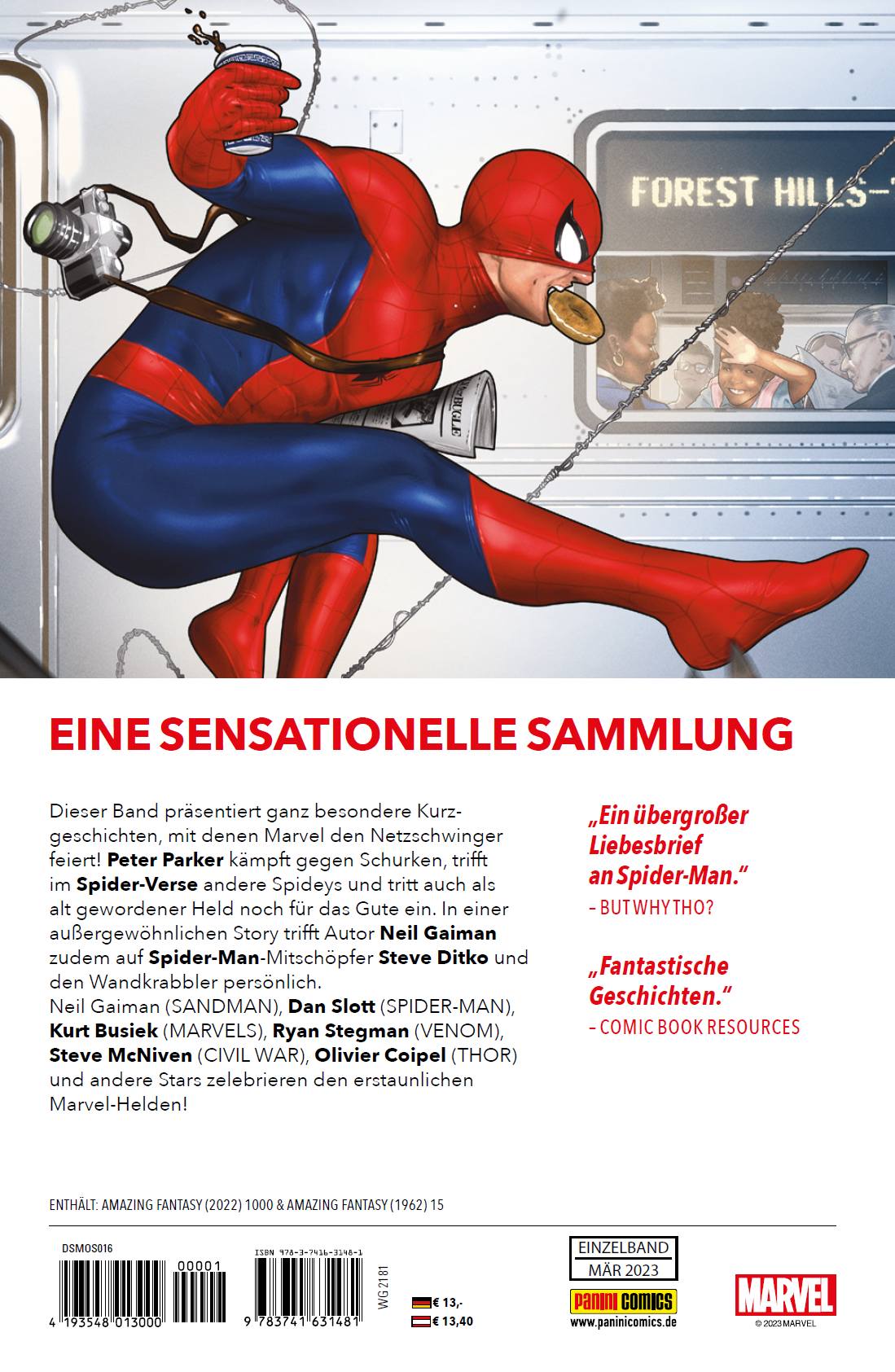 EINE SENSATIONELLE SAMMLUNGDieser Band präsentiert ganz besondere Kurzgeschichten, mit denen Marvel den Netzschwinger feiert! Peter Parker kämpft gegen Schurken, trifft im Spider-Verse andere Spideys und tritt auch als alt gewordener Held noch für das Gute ein. In einer außergewöhnlichen Story trifft Autor Neil Gaiman zudem auf Spider-Man-Mitschöpfer Steve Ditko und den Wandkrabbler persönlich. Neil Gaiman (SANDMAN), Dan Slott (SPIDER-MAN), Kurt Busiek (MARVELS), Ryan Stegman (VENOM), Steve McMiven (CIVIL WAR), Olivier Coipel (THOR) und andere Stars zelebrieren den erstaunlichen Marvel-Helden!ENTHÄLT: AMAZING FANTASY (2022) 1000 & AMAZING FANTASY (1962) 15