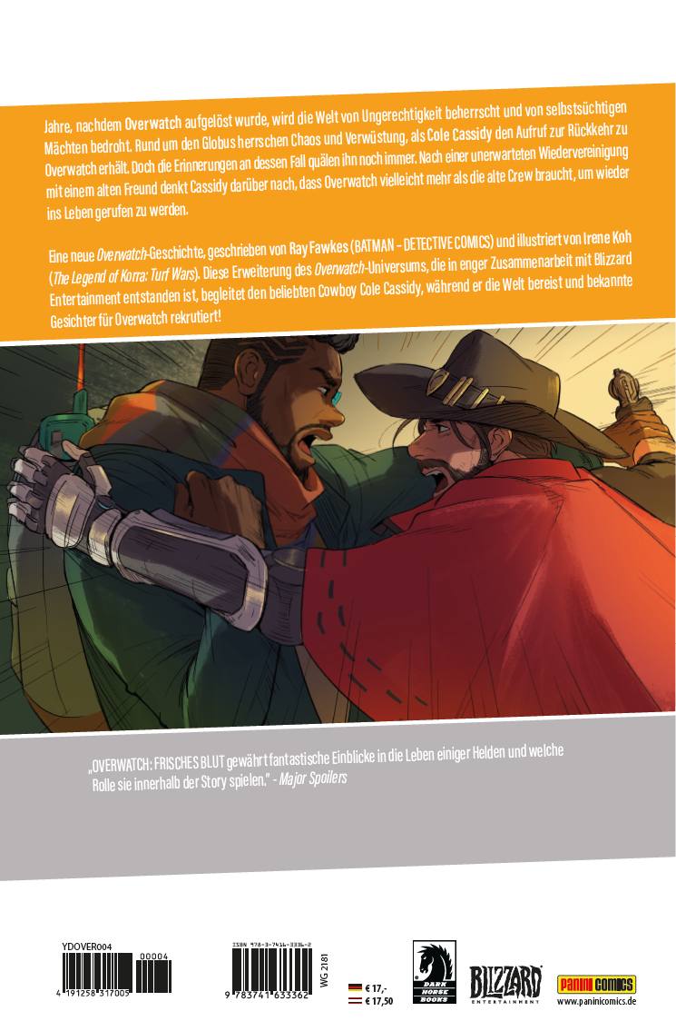 Jahre, nachdem Overwatch aufgelöst wurde, wird die Welt von Ungerechtigkeit beherrscht und von selbstsüchtigen Mächten bedroht. Rund um den Globus herrschen Chaos und Verwüstung, als Cole Cassidy den Aufruf zur Rückkehr zu Overwatch erhält. Doch die Erinnerungen an dessen Fall quälen ihn noch immer. Nach einer unerwarteten Wiedervereinigung mit einem alten Freund denkt Cassidy darüber nach, dass Overwatch vielleicht mehr als die alte Crew braucht, um wieder ins Leben gerufen zu werden. Eine neue Overwatch-Geschichte, geschrieben von Ray Fawkes (BATMAN - DETECTIVE COMICS) und illustriert von Irene Koh (The Legend of Korra: Turf Wars). Diese Erweiterung des Overwatch-Universums, die in enger Zusammenarbeit mit Blizzard Entertainment entstanden ist, begleitet den beliebten Cowboy Cole Cassidy, während er die Welt bereist und bekannte Gesichter für Overwatch rekrutiert!