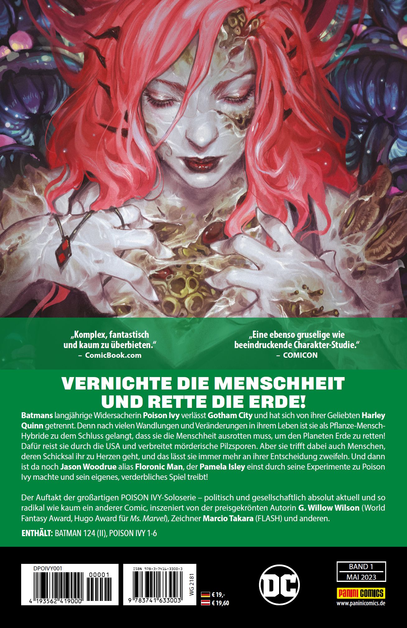 VERNICHTE DIE MENSCHHEIT UND RETTE DIE ERDE!Batmans langjährige Widersacherin Poison Ivy verlässt Gotham City und hat sich von ihrer Geliebten Harley Quinn getrennt. Denn nach vielen Wandlungen und Veränderungen in ihrem Leben ist sie als Pflanzen-Mensch-Hybrid zu dem Schluss gelangt, dass sie die Menschheit ausrotten muss, um den Planeten Erde zu retten! Dafür reist sie durch die USA und verbreitet mörderische Pilzsporen. Aber sie trifft dabei auch Menschen, deren Schicksal ihr zu Herzen geht, und das lässt sie immer mehr an ihrer Entscheidung zweifeln. Und dann ist da noch Jason Woodrue alias Floronic Man, der Pamela Isley einst durch seine Experimente zu Poison Ivy machte und sein eigenes, verderbliches Spiel treibt!Der Auftakt der großartigen POISON IVY-Soloserie - politisch und gesellschaftlich absolut aktuell und so radikal wie kaum ein anderer Comic, inszeniert von der preisgekrönten Autorin G. Willow Wilson (World Fantasy Award, Hugo Award für Ms. Marvel), Zeichner Marcio Takara (FLASH) und anderen.ENTHÄLT: BATMAN 124 (II), POISON IVY 1-6