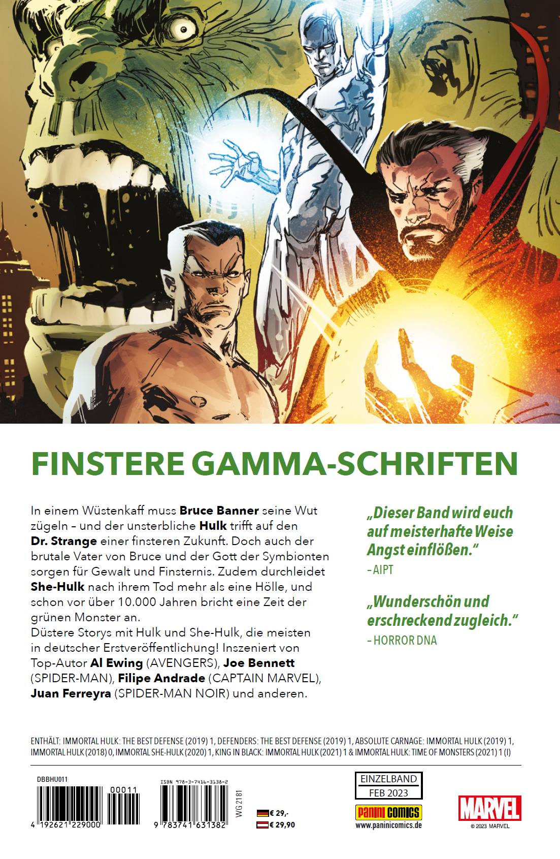FINSTERE GAMMA-SCHRIFTEN In einem Wüstenkaff muss Bruce Banner seine Wut zügeln - und der unsterbliche Hulk trifft auf den Dr. Strange einer finsteren Zukunft. Doch auch der brutale Vater von Bruce und der Gott der Symbionten sorgen für Gewalt und Finsternis. Zudem durchleidet She-Hulk nach ihrem Tod mehr als eine Hölle, und schon vor über 10.000 Jahren bricht eine Zeit der grünen Monster an. Düstere Storys mit Hulk und She-Hulk, die meisten in deutscher Erstveröffentlichung! Inszeniert von Top-Autor Al Ewing (AVENGERS), Joe Bennett (SPIDER-MAN), Filipe Andrade (CAPTAIN MARVEL), Juan Ferreyra (SPIDER-MAN NOIR) und anderen. ENTHÄLT: IMMORTAL HULK: THE BEST DEFENSE (2019) 1, DEFENDERS: THE BEST DEFENSE (2019) 1, ABSOLUTE CARNAGE: IMMORTAL HULK (2019) 1, IMMORTAL HULK (2018) 0, IMMORTAL SHE-HULK (2020) 1, KING IN BLACK: IMMORTAL HULK (2021) 1 & IMMORTAL HULK: TIME OF MONSTERS (2021) 1 (I)