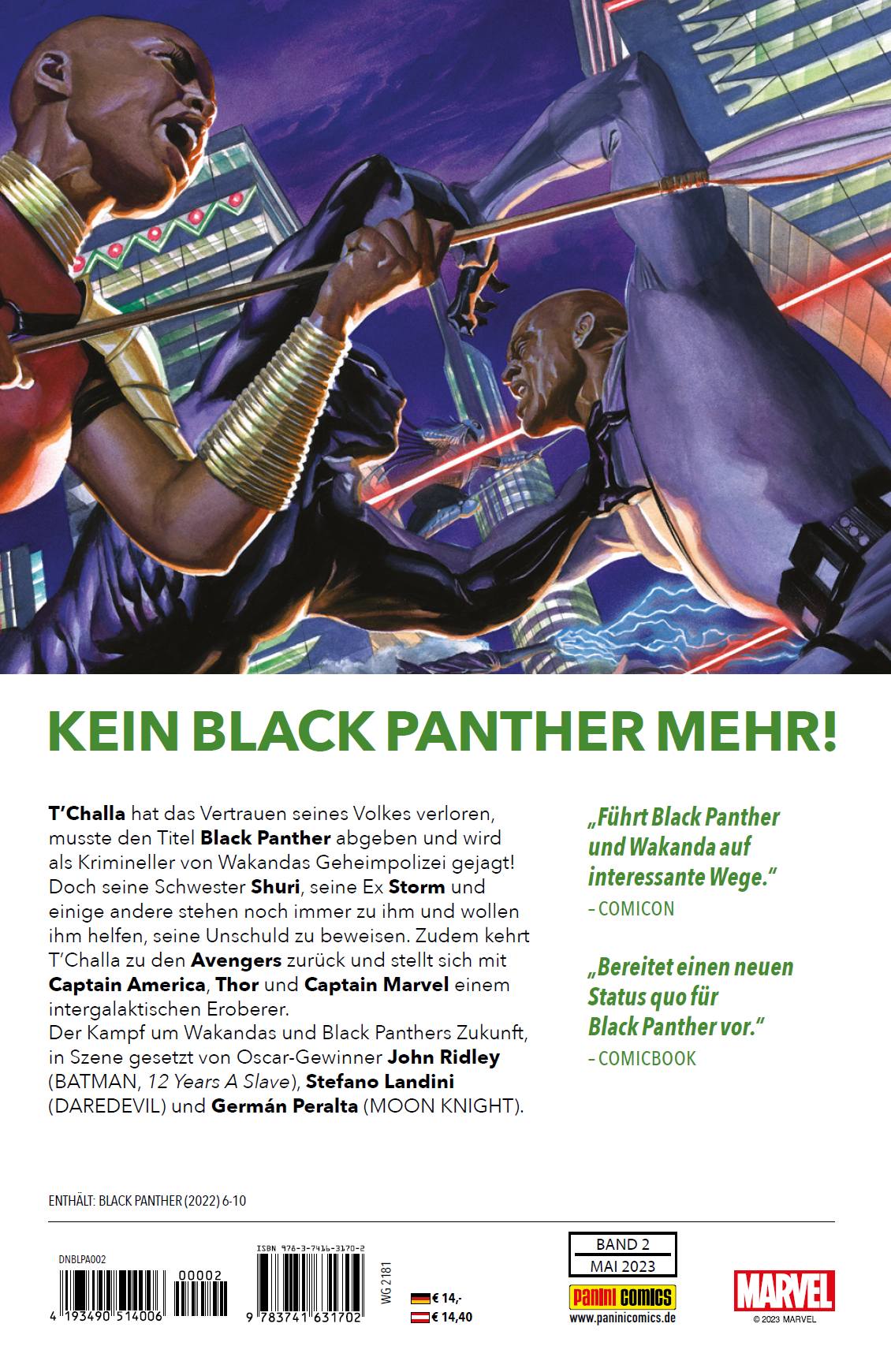 KEIN BLACK PANTHER MEHR! T'Challa hat das Vertrauen seines Volkes verloren, musste den Titel Black Panther abgeben und wird als Krimineller von Wakandas Geheimpolizei gejagt! Doch seine Schwester Shuri, seine Ex Storm und einige andere stehen noch immer zu ihm und wollen ihm helfen, seine Unschuld zu beweisen. Zudem kehrt T'Challa zu den Avengers zurück und stellt sich mit Captain America, Thor und Captain Marvel einem intergalaktischen Eroberer. Der Kampf um Wakandas und Black Panthers Zukunft, in Szene gesetzt von Oscar-Gewinner John Ridley (BATMAN, 12 Years A Slave), Stefano Landini (DAREDEVIL) und Germán Peralta (MOON KNIGHT).ENTHÄLT: BLACK PANTHER (2022) 6-10
