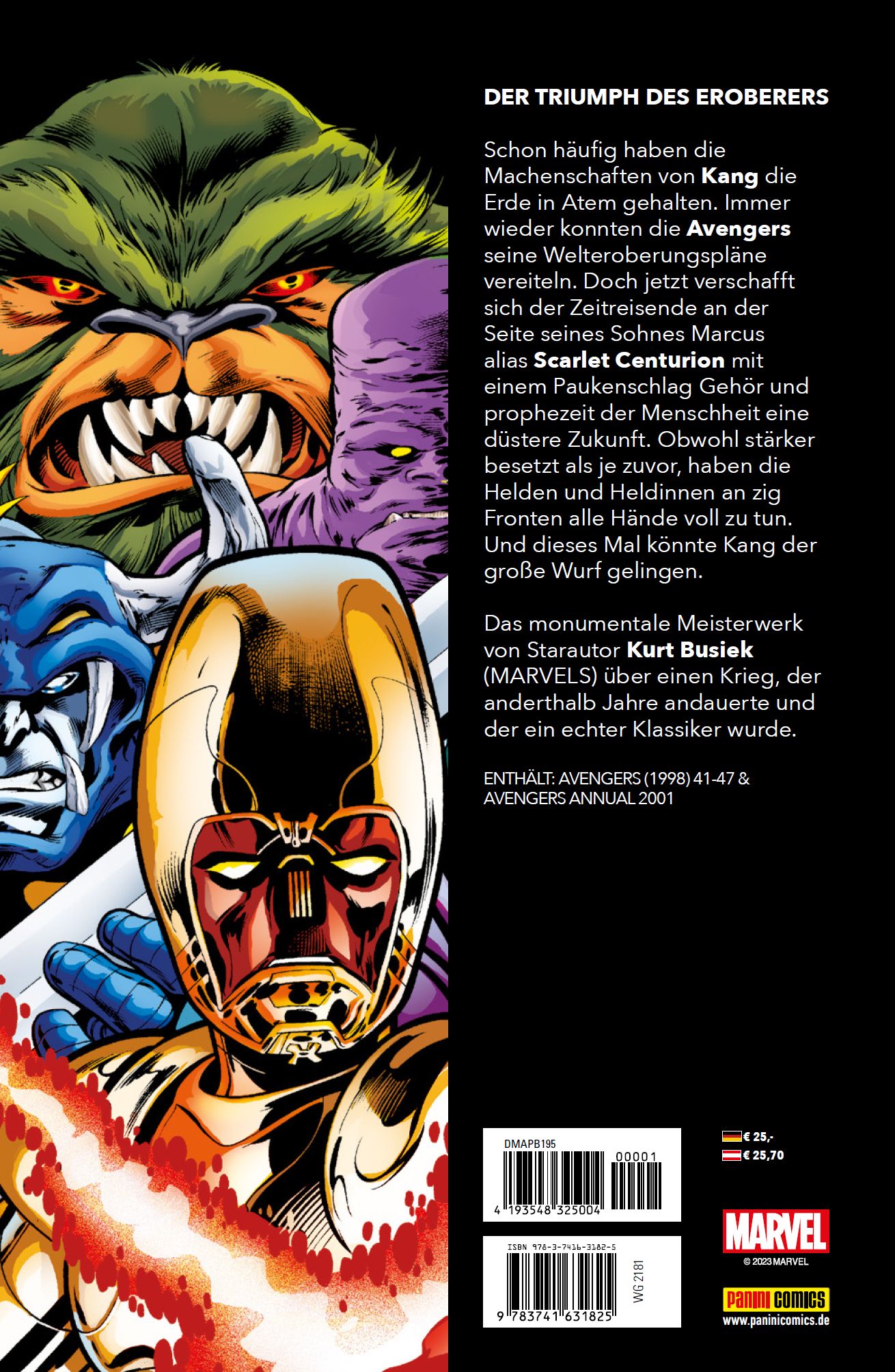 DER TRIUMPH DES EROBERERS Schon häufig haben die Machenschaften von Kang die Erde in Atem gehalten. Immer wieder konnten die Avengers seine Welteroberungspläne vereiteln. Doch jetzt verschafft sich der Zeitreisende an der Seite seines Sohnes Marcus alias Scarlet Centurion mit einem Paukenschlag Gehör und prophezeit der Menschheit eine düstere Zukunft. Obwohl stärker besetzt als je zuvor, haben die Helden und Heldinnen an zig Fronten alle Hände voll zu tun. Und dieses Mal könnte Kang der große Wurf gelingen. Das monumentale Meisterwerk von Starautor Kurt Busiek (MARVELS) über einen Krieg, der anderthalb Jahre andauerte und der ein echter Klassiker wurde. ENTHÄLT: AVENGERS (1998) 41-47 & AVENGERS ANNUAL 2001