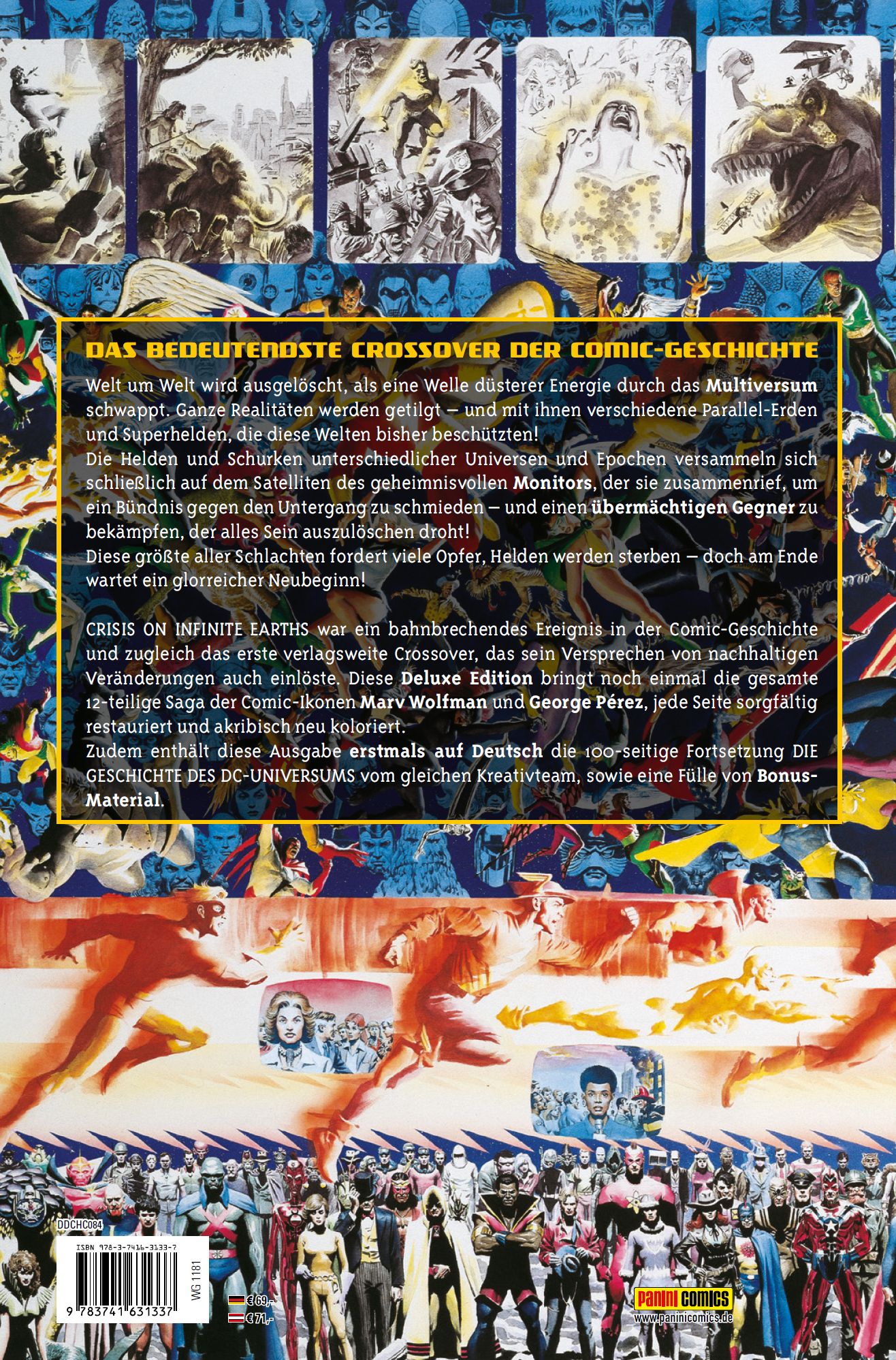 DAS BEDEUTENDSTE CROSSOVER DER COMIC-GESCHICHTEWelt um Welt wird ausgelöscht, als eine Welle düsterer Energie durch das Multiversum schwappt. Ganze Realitäten werden getilgt - mit ihren verschiedene Parallel-Erden und Superhelden, die diese Welten bisher beschützten! Die Helden und Schurken verschiedener Universen und Epochen versammeln sich schließlich auf dem Satelliten des geheimnisvollen Monitors, der sie zusammenrief, um ein Bündnis gegen den Untergang zu schmieden - und einen übermächtigen Gegner zu bekämpfen, der alles Sein auszulöschen droht! Diese größte aller Schlachten fordert viele Opfer, Helden werden sterben - doch am Ende wartet ein glorreicher Neubeginn!CRISIS ON INFINITE EARTHS war ein bahnbrechendes Ereignis in der Comic-Geschichte und zugleich das erste verlagsweite Crossover, das sein Versprechen von nachhaltigen Veränderungen auch einlöste. Diese Deluxe Edition bringt noch einmal die gesamte 12-teilige Saga der Comic-Ikonen Marv Wolfman und George Pérez, jede Seite sorgfältig restauriert und akribisch neu koloriert. Zudem enthält diese Ausgabe erstmals auf Deutsch die 100-seitige Fortsetzung DIE GESCHICHTE DES DC-UNIVERSUMS vom gleichen Kreativteam, sowie eine Fülle von Bonus-Material.