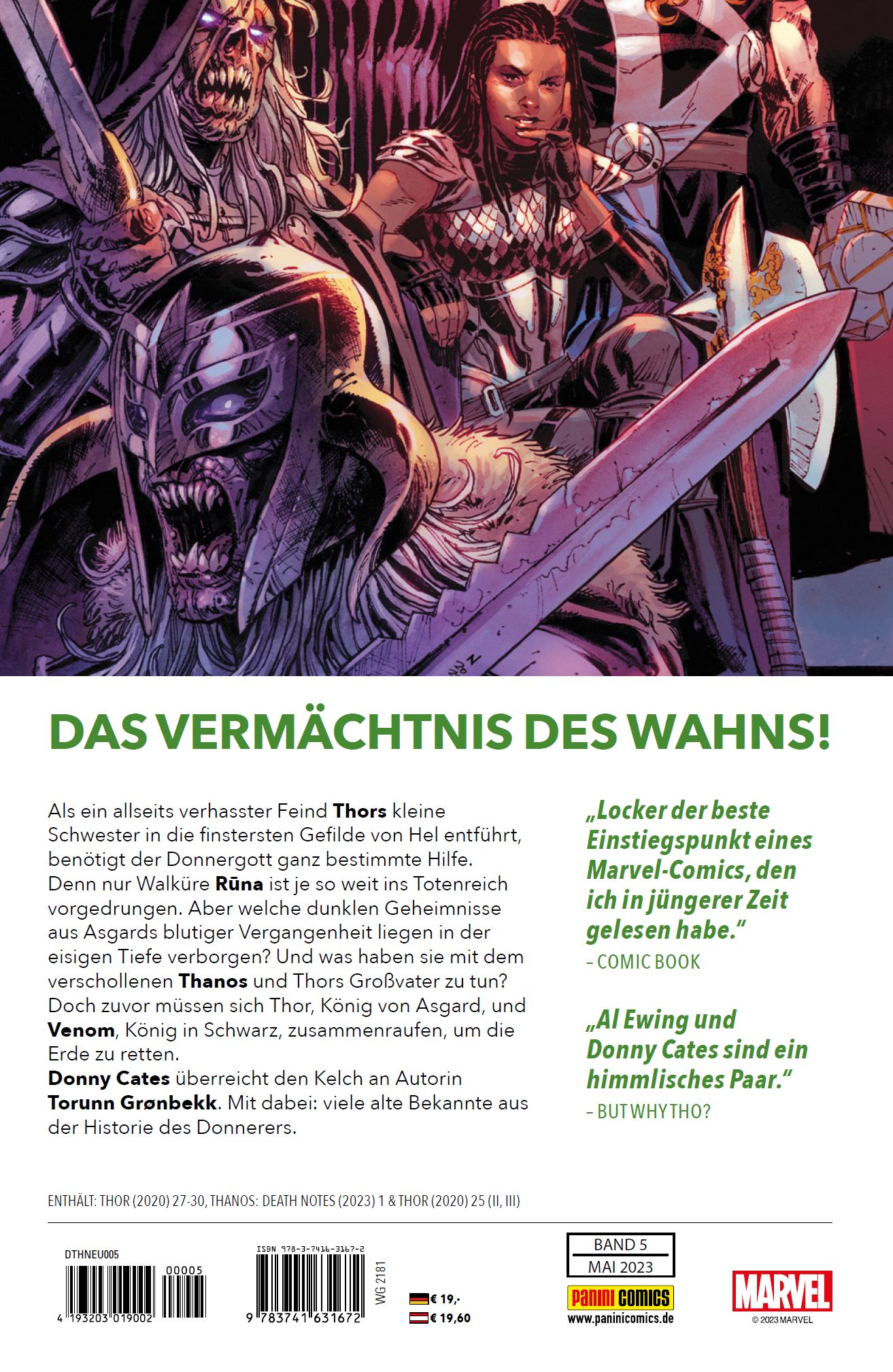 DAS VERMÄCHTNIS DES WAHNS!Als ein allseits verhasster Feind Thors kleine Schwester in die finstersten Gefilde von Hel entführt, benötigt der Donnergott ganz bestimmte Hilfe. Denn nur Walküre Runa ist je so weit ins Totenreich vorgedrungen. Aber welche dunklen Geheimnisse aus Asgards blutiger Vergangenheit liegen in der eisigen Tiefe verborgen? Und was haben sie mit dem verschollenen Thanos und Thors Großvater zu tun? Doch zuvor müssen sich Thor, König von Asgard, und Venom, König in Schwarz, zusammenraufen, um die Erde zu retten.Donny Cates überreicht den Kelch an Autorin Torunn Grønbekk. Mit dabei: viele alte Bekannte aus der Historie des Donnerers.ENTHÄLT: THOR (2020) 27-30, THANOS: DEATH NOTES (2023) 1 & THOR (2020) 25 (II, III)