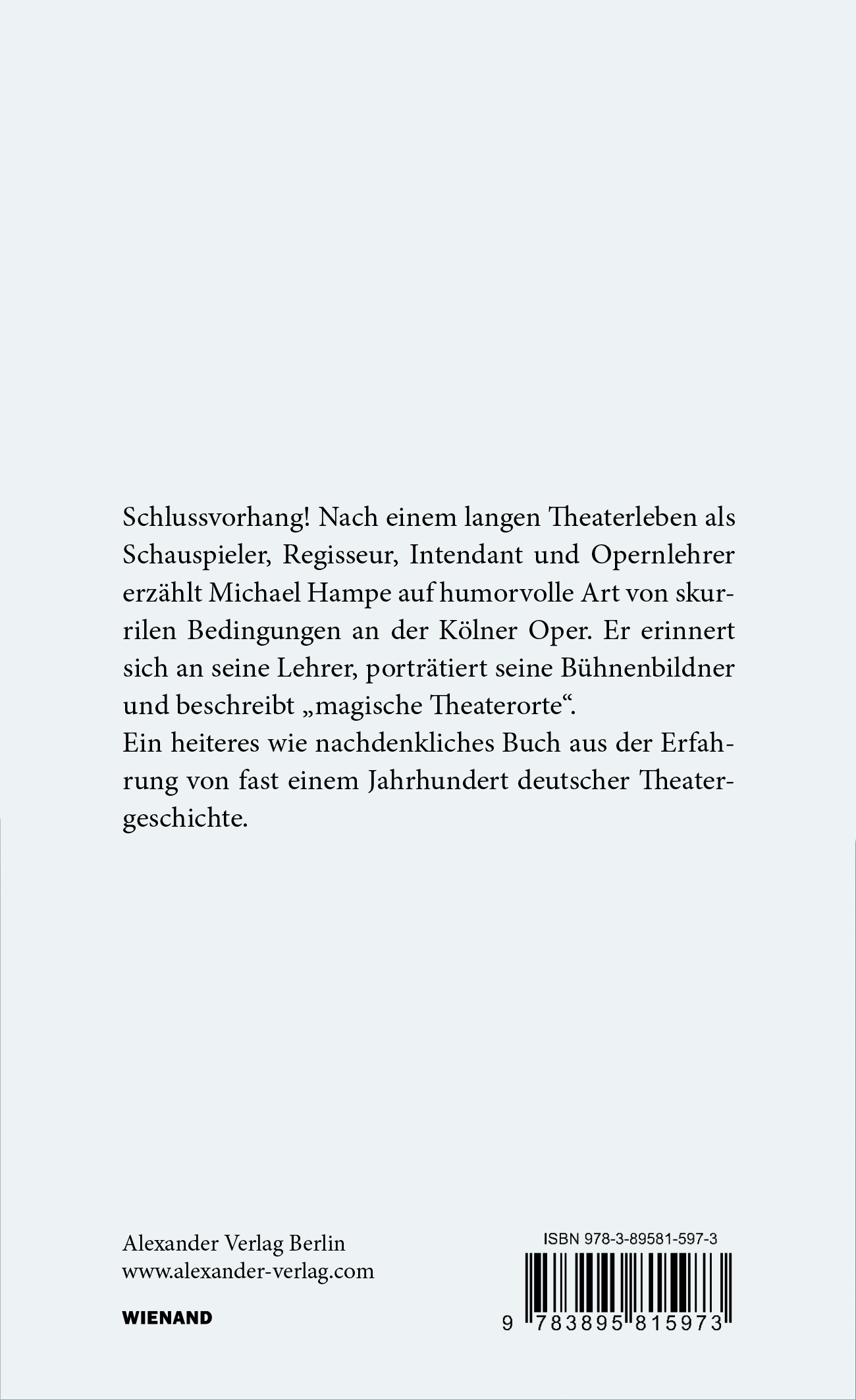 Erinnerungen des Opern- und Schauspielregisseurs Michael Hampe, die fast ein Jahrhundert deutsche Theatergeschichte beleuchten.Nach einem langen Theaterleben als Schauspieler, Regisseur, Intendant und Opernlehrer erzählt Michael Hampe auf humorvolle Art unter anderem die Geschichte seiner zwanzigjährigen Leitung der Kölner Oper unter den bisweilen skurrilen Bedingungen der alten Stadt am Rhein. Er erinnert sich an seine Lehrer, denen er sein Handwerk und seine Karriere zu verdanken hat. Er portraitiert seine Bühnenbildner, die ihm Weggenossen und enge Freunde waren, und beschreibt einige »magische Theaterorte«, an denen er arbeiten konnte. Zitate und Aphorismen, die sein Leben begleitet und ihn oft auch geleitet haben, ergänzen seine Erinnerungen. Zudem äußert er sich kritisch zum (heutigen) Theaterbetrieb.»Dramaturgie hat als Mutter aller dramatischen Künste für Ordnung, Übersicht, Richtigkeit und Ausdrucksdisziplin zu sorgen. Die Oper liebt die Zucht dieser Mutter nicht, sie kann sich ja in der Musik baden und im Gefühl schwelgen, in einem fröhlichen Ungefähr. Deshalb wird gute Dramaturgie hier kaum bemerkt, und schlechte ebenso. Wenn ich ein Charakteristikum meiner 20-jährigen Kölner Intendanz hervorheben soll, so würde ich dieses nennen: eine bessere, den Werken angemessenere Dramaturgie. Das Kölner wie das internationale Publikum hat sie gespürt.« Michael Hampe