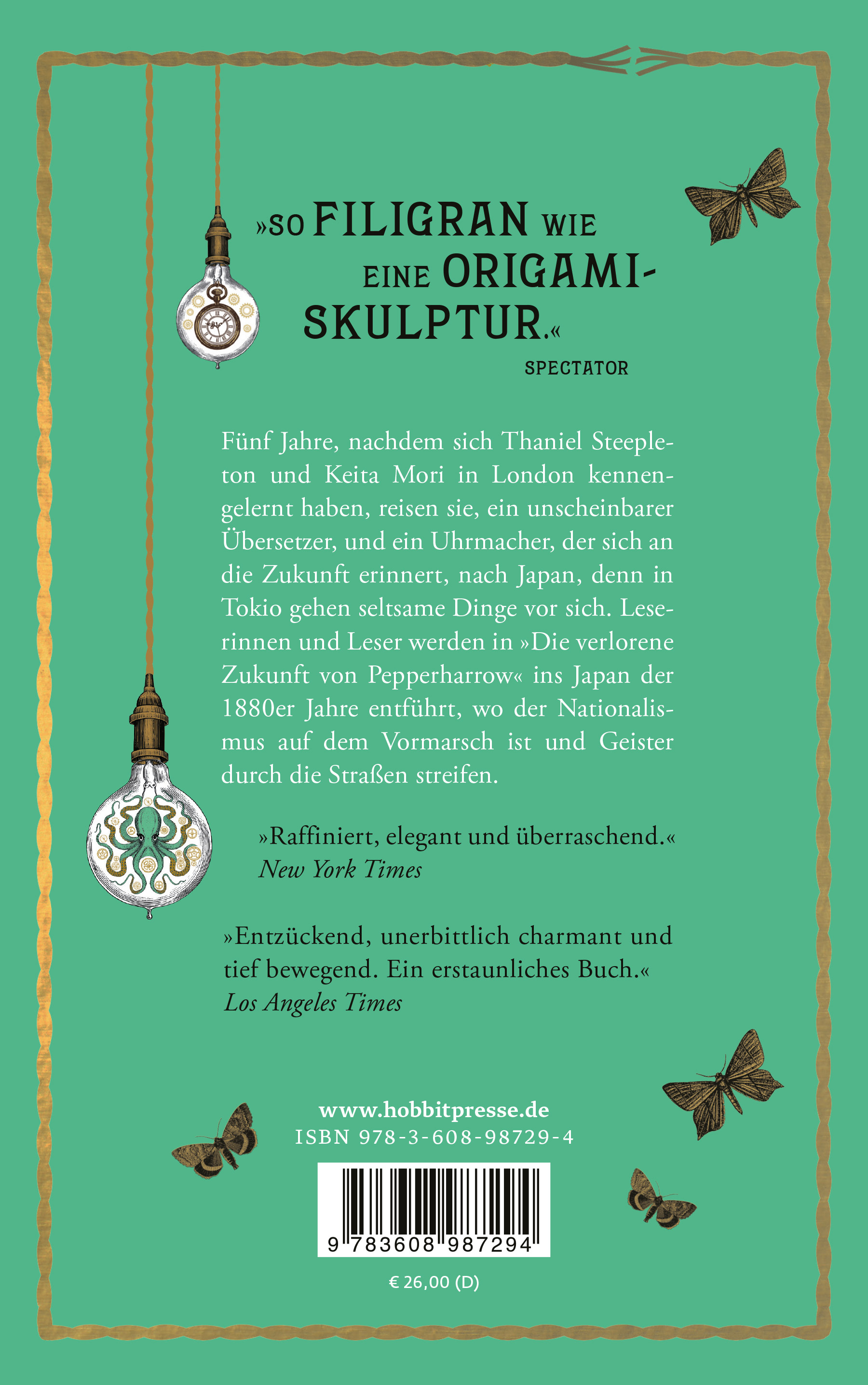 »Hellseher haben eine besondere Begabung im Umgang mit der Zeit - daher war es mehr als plausibel, dass Keita Mori ausgerechnet als Uhrmacher tätig war.« Leserinnen und Leser werden in »Die verlorene Zukunft von Pepperharrow« ins Japan der 1880er Jahre entführt, wo der Nationalismus auf dem Vormarsch ist und Geister durch die Straßen streifen.