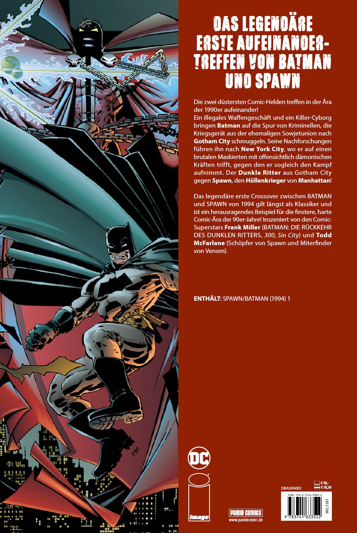 DAS LEGENDÄRE ERSTE AUFEINANDERTREFFEN VON BATMAN UND SPAWNDie zwei düstersten Comic-Helden treffen in der Ära der 1990er aufeinander! Ein illegales Waffengeschäft und ein Killer-Cyborg bringen Batman auf die Spur von Kriminellen, die Kriegsgerät aus der ehemaligen Sowjetunion nach Gotham City schmuggeln. Diese Spur führt ihn nach New York City, wo er auf einen brutalen Maskierten mit offensichtlich dämonischen Kräften trifft und gegen den er sogleich den Kampf aufnimmt. Der Dunkle Ritter aus Gotham City gegen Spawn, den Höllenkrieger von Manhattan! Das legendäre erste Crossover zwischen BATMAN und SPAWN von 1994 gilt längst als Klassiker und ist ein herausragendes Beispiel für die finstere, harte Comic-Ära der 90er-Jahre! Inszeniert von den Comic- Superstars Frank Miller (BATMAN: DIE RÜCKKEHR DES DUNKLEN RITTERS, 300, Sin City) und Todd McFarlane (Schöpfer von Spawn und Miterfinder von Venom).ENTHÄLT: SPAWN/BATMAN (1994) 1Diese Story ist ein Pendant zu BATMAN: DIE RÜCKKEHR DES DUNKLEN RITTERS von DC COMICS und nicht in der regulären DC-Kontinuität angesiedelt.