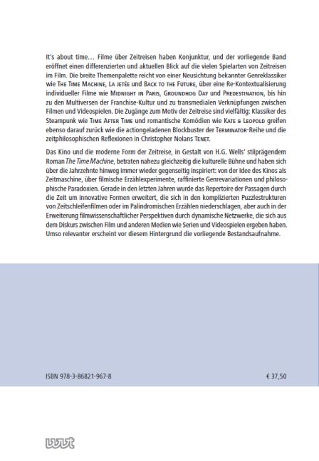 Das Kino und die moderne Form der Zeitreise, in Gestalt von H.G. Wells' stilprägendem Roman "The Time Machine", betraten nahezu gleichzeitig die kulturelle Bühne und haben sich über die Jahrzehnte hinweg immer wieder gegenseitig inspiriert: von der Idee des Kinos als Zeitmaschine, über filmische Erzählexperimente, raffinierte Genrevariationen und philosophische Paradoxien. Gerade in den letzten Jahren wurde das Repertoire der Passagen durch die Zeit um innovative Formen erweitert, die sich in den komplizierten Puzzlestrukturen von Zeitschleifenfilme oder im Palindromischen Erzählen niederschlagen, aber auch in der Erweiterung filmwissenschaftlicher Perspektiven durch dynamische Netzwerke, die sich aus dem Diskurs zwischen Film und anderen Medien wie Serien und Videospielen ergeben haben. Umso relevanter erscheint vor diesem Hintergrund die vorliegende Bestandsaufnahme.
