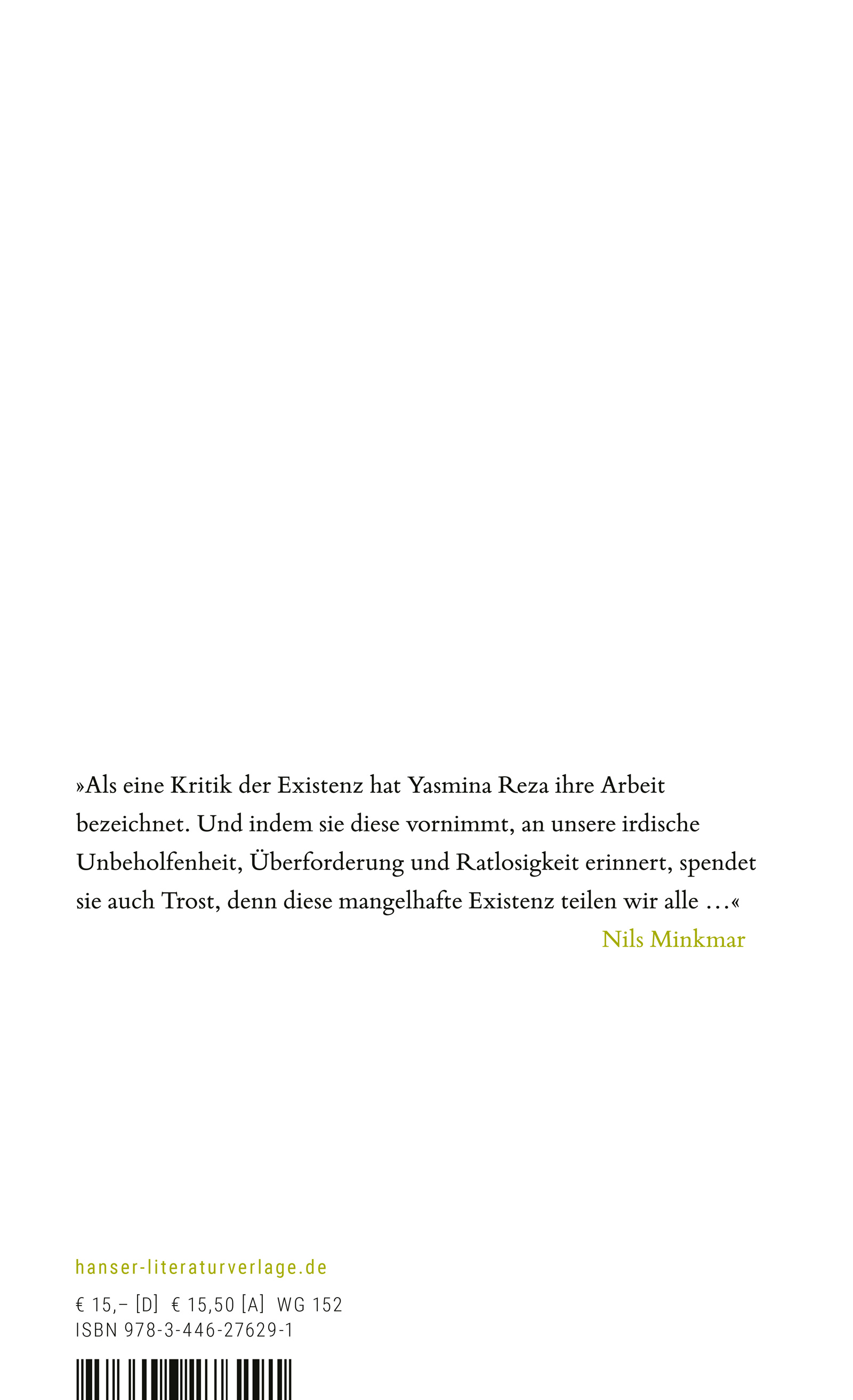 Yasmina Reza, 1959 geboren, ist Schriftstellerin, Regisseurin und Schauspielerin und die meistgespielte zeitgenössische Theaterautorin. Bei Hanser erschienen u.a. »Glücklich die Glücklichen« (Roman, 2014), »Babylon« (Roman, 2017), für den sie mit dem Prix Renaudot 2016 ausgezeichnet wurde, »Kunst« (Schauspiel, 2018), »Der Gott des Gemetzels« (Schauspiel, 2018), »Bella Figura« (Schauspiel, 2019), »Drei Mal Leben« (Schauspiel, 2019), »Anne-Marie die Schönheit« (2019), »Serge« (Roman, 2022) und »James Brown trug Lockenwickler« (Schauspiel, 2023). Für ihr Werk wurde sie zuletzt mit dem Jonathan-Swift-Preis 2020, dem Premio Malaparte 2021, dem Prix de l'Académie de Berlin 2022 und dem Prix Mondial Cino del Duca 2024 ausgezeichnet. Das Theaterstück Der Gott des Gemetzels wurde 2011 sehr erfolgreich von Roman Polanski verfilmt, hochkarätig besetzt mit Jodie Foster, Kate Winslet, Christoph Waltz und John C. Reilly.