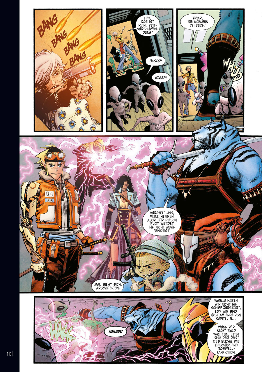 Die Plot Holes sind die unwahrscheinlichste Heldentruppe des literarischen Multiversums: ein Manga-Cyborg-Samurai, ein gestaltwandelnder Tiger-Barbar, ein altkluges Kid aus einem Zeitungscomic und eine Vampir-Assassinen-Piratin. Angeführt von der mysteriösen Red reisen die Plot Holes in fremde Bücher, um miese Stories aufzupeppen und sie so vor der Vernichtung zu bewahren. Der mittelmäßige Comic-Zeichner Cliff Wieselwitz lebt in einer dieser unrettbaren Geschichten. Doch kurz bevor seine Realität zerstört wird, rekrutiert Red ihn als neuestes Mitglied ihres Teams. Denn am Horizont zeichnet sich eine monumentale Bedrohung ab...»Plot Holes« ist die glühende Liebeserklärung von Allround-Talent Sean Murphy (»Tokyo Ghost«, »Batman: Der weiße Ritter«) an jede Form von Fiktion. Ein atemlos erzählter Trip durch alle Genres, randvoll mit Hommagen, Zitaten und Referenzen, die nicht nur Comic-Fans begeistern.