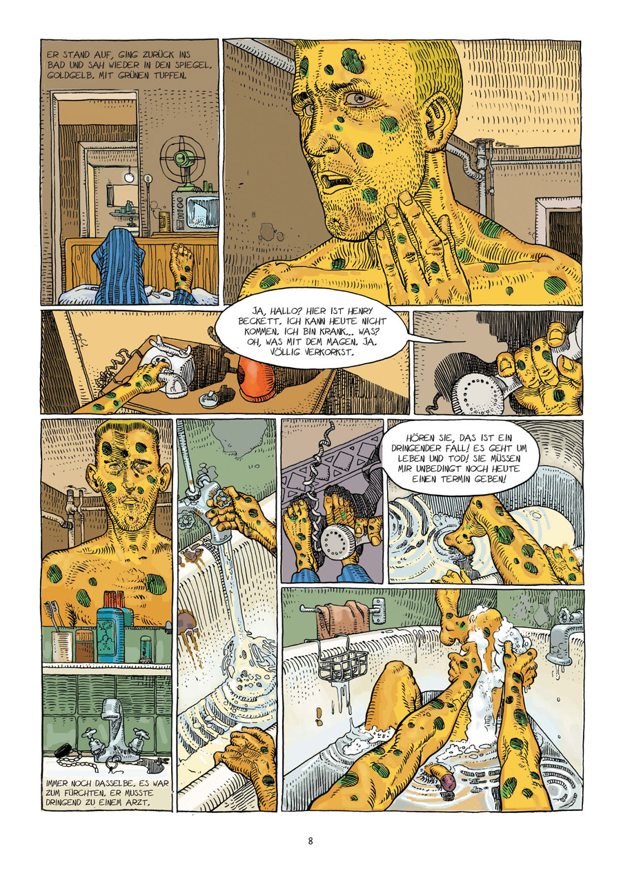 Charles Bukowski, der »Dirty Old Man« der US-amerikanischen Underground-Literatur, war ein Autor ohne Kompromisse: Apokalyptische Visionen seiner Wahlheimat Los Angeles, die unmenschliche Härte des Alltags in der working class und der schleichende Tod, den der unheilige Bund aus Einsamkeit und Alkohol mit sich bringt, waren seine Themen.Wer könnte Bukowski besser auf die Comicseite bannen als Matthias Schultheiss? »Die Haie von Lagos«, »Die Wahrheit über Shelby«, »Daddy« - gebrochene Helden, allumfassender Zynismus und gleichgültige Brutalität begegnen uns in seinen Werken an jeder Ecke. »Kaputt in der City« umfasst Schultheiss' Interpretationen von 8 Bukowski-Kurzgeschichten, die bis ins Mark gehen.Der Klassiker erstmals in Farbe! Matthias Schultheiss selbst besorgt die Koloration dieser hochwertigen Neuausgabe von »Kaputt in der City«.Auch erhältlich als limitierte Vorzugsausgabe mit alternativen Cover und signiertem Kunstdruck