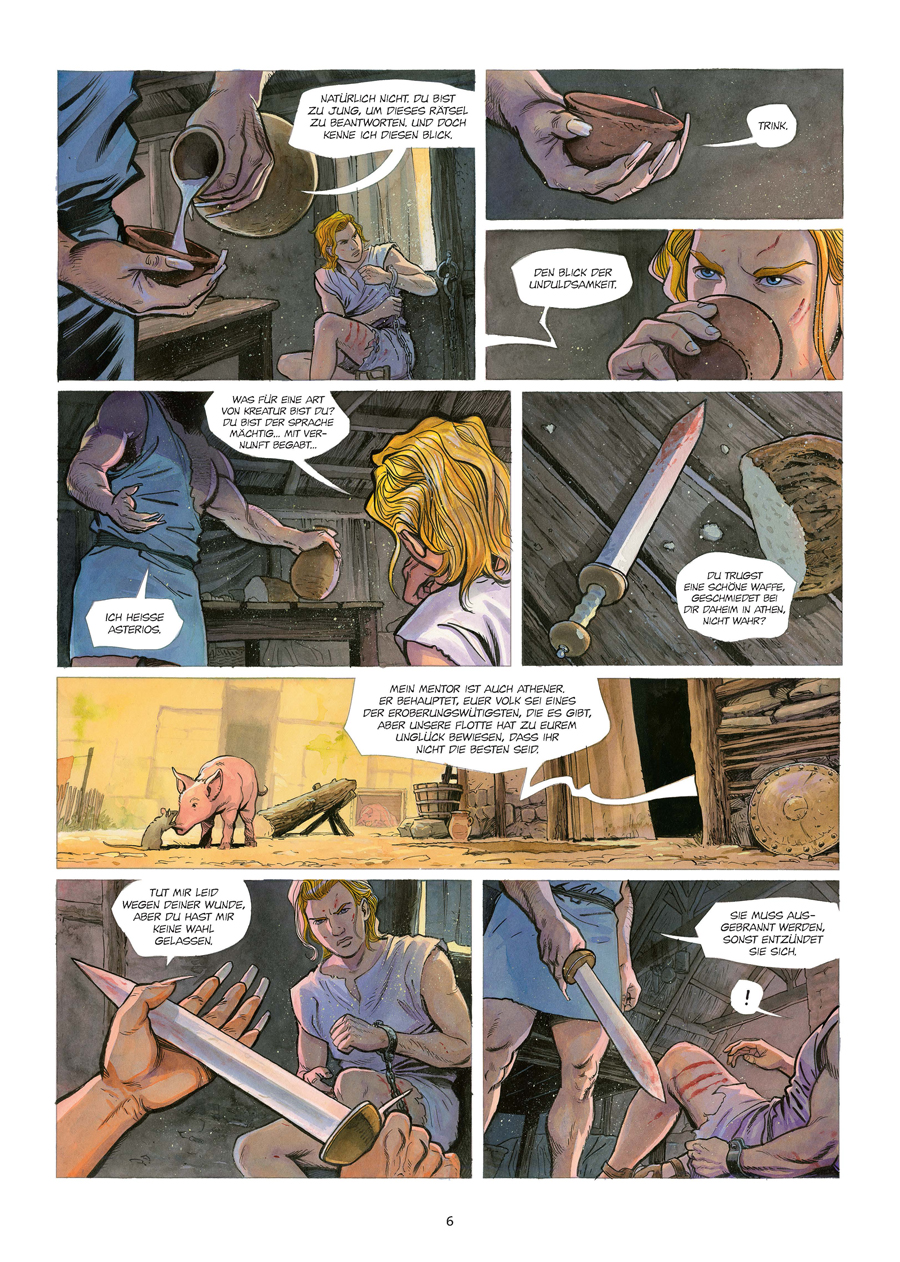 In der Folge eines tragischen Unfalls, bei dem sein eigener Sohn den Tod fand, sieht sich der berühmte Architekt Daedalus gezwungen, Ahten zu verlassen und nach Kreta zu fliehen. Dort streiten sich drei Brüder um den unbesetzten Thron. Einer von ihnen, Minos mit Namen, geht einen Pakt mit dem Gott Poseidon ein, der einen herrlichen Stier aus dem Meer entsteigen lässt, wodurch sich Minos' Vorhersage erfüllt und er zum König wird. Doch er bricht seinen Teil des Paktes, und Poseidon bestraft ihn dafür schwer: Er zwingt die Königin, sich mit dem Stier einzulassen, und aus der unnatürlichen Vereinigung entsteht ein monströses Kind, halb Mensch, halb Tier - der Minotaurus! Entsetzt bittet Minos Daedalus darum, das Untier einzusperren, und der Architekt errichtet das Labyrinth zu diesem Zweck. Bis eines Tages der Held Theseus auf Kreta erscheint, um den Minotaurus mithilfe der Prinzessin Ariadne zu töten...Mensch oder Monster? Serge Le Tendre macht aus dem Mythos des Minotauren eine anrührende Geschichte, tragisch und nachdenklich, die von Patrick Peynet in wunderschönen Bildern erzählt wird.