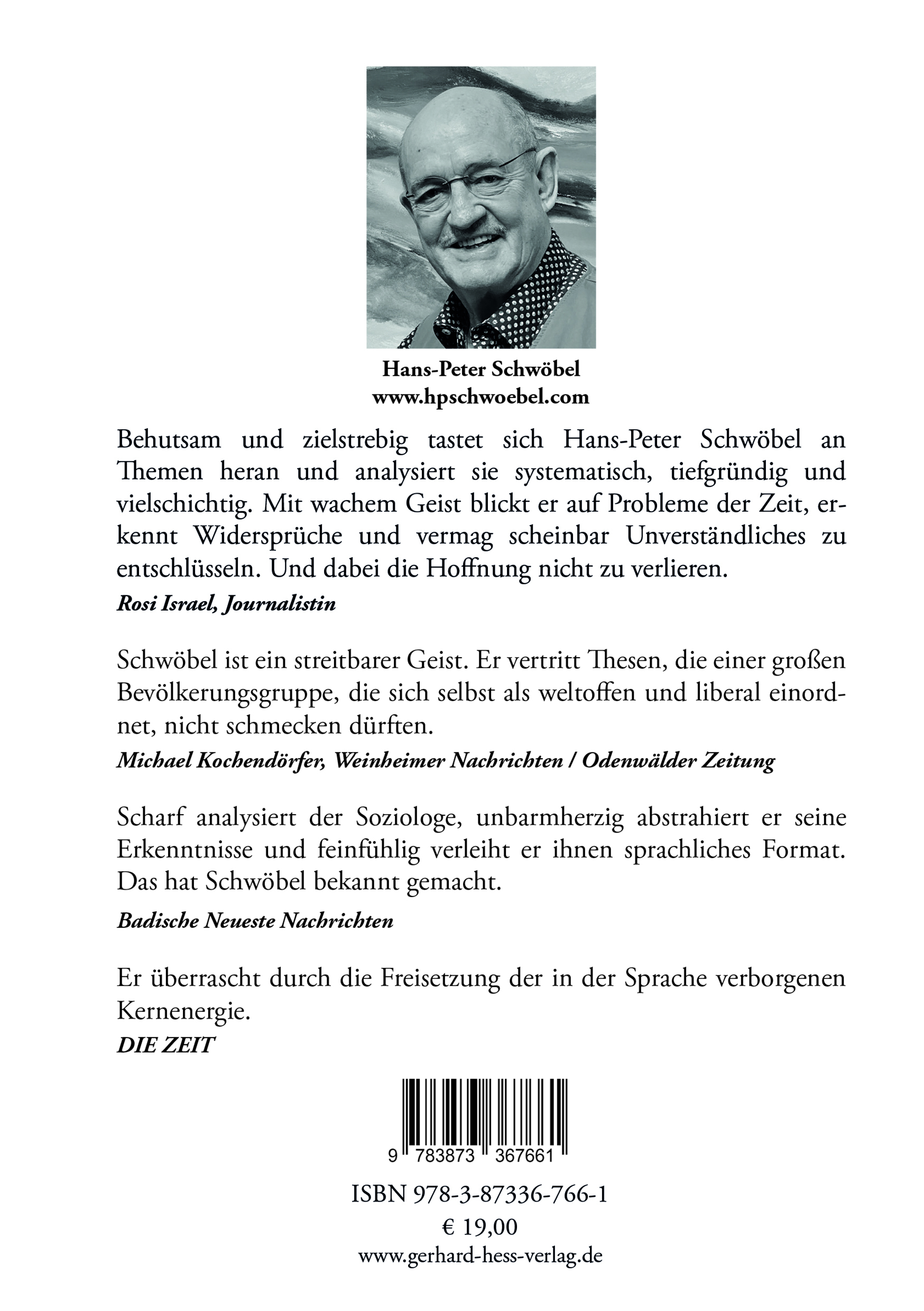 Behutsam und zielstrebig tastet sich Hans-Peter Schwobel an Themen heran und analysiert sie systematisch, tiefgründig und vielschichtig. Mit wachem Geist blickt er auf Probleme der Zeit, erkennt Widersprüche und vermag scheinbar Unverstandliches zu entschlüsseln. Und dabei die Hoffnung nicht zu verlieren. (Rosi Israel, Journalistin) Schwöbel ist ein streitbarer Geist. Er vertritt Thesen, die einer großen Bevölkerungsgruppe, die sich selbst als weltoffen und liberal einordnet, nicht schmecken dürften. (Michael Kochendörfer, Weinheimer Nachrichten / Odenwalder Zeitung) Scharf analysiert der Soziologe, unbarmherzig abstrahiert er seine Erkenntnisse und feinfühlig verleiht er ihnen sprachliches Format. Das hat Schwöbel bekannt gemacht. (Badische Neueste Nachrichten) Er überrascht durch die Freisetzung der in der Sprache verborgenen Kernenergie. (DIE ZEIT)