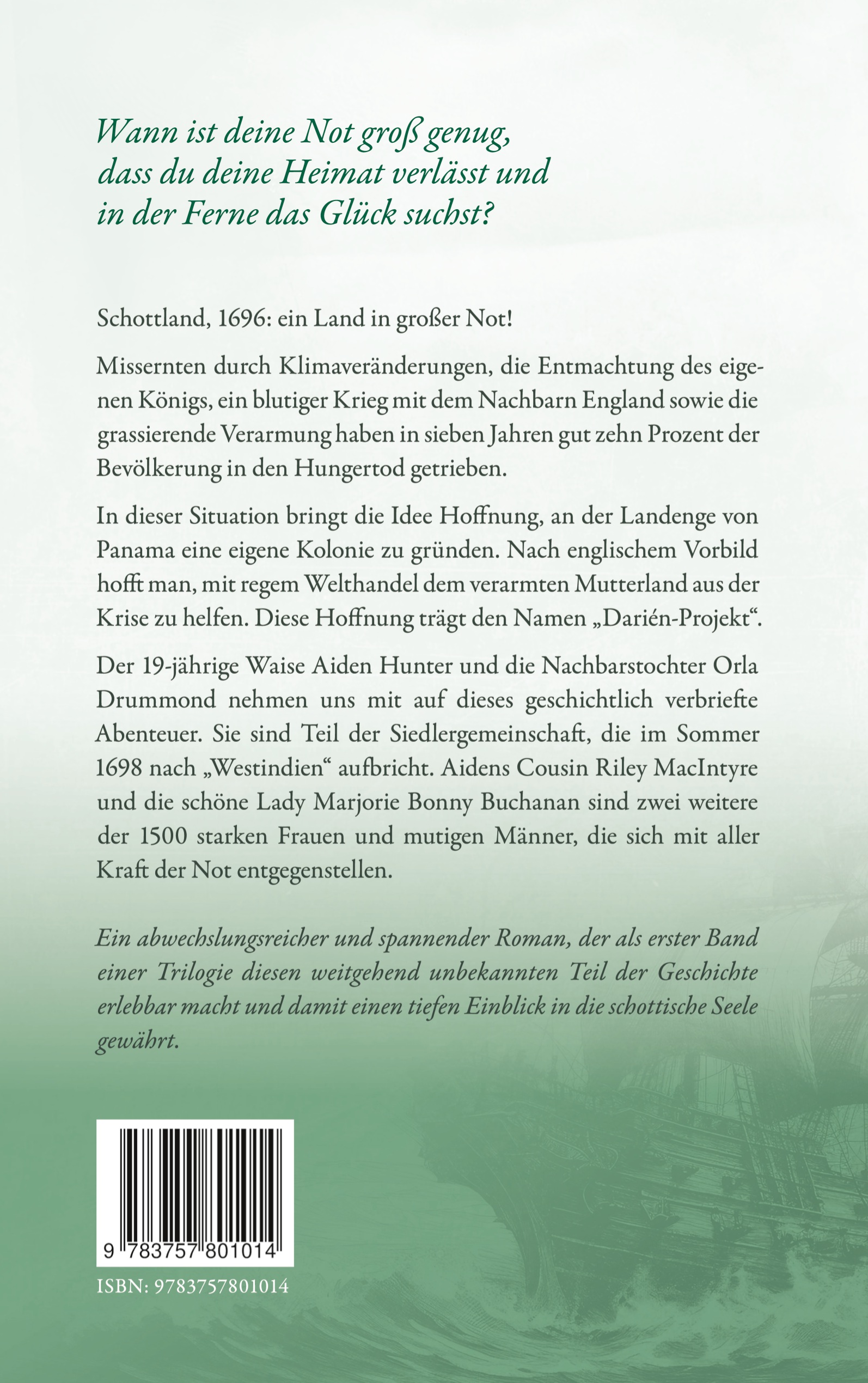 | Schlagworte | 17. Jahrhundert Schottland Roman • Abenteuer • Abenteuerliche Koloniegründung in Panama • Darién-Projekt • Heimatflucht und Neuanfang • Historische Fiktion mit Liebesbezug • Historischer Roman • Historischer Roman Darién‑Projekt • Junge Liebe im Kolonialabenteuer • Koloniales Abenteuer • Koloniales Abenteuer Roman • Kolonialgeschichte • Kolonialgründung Panama 1698 • Kolonialkrise historischer Roman • Krieg und Kolonisierung • Liebe • Liebe in Notzeiten • mutige Frauen • Mutige Frauen Roman Schottland • Panama‑Kolonie Abenteuerroman • Schicksalsgemeinschaft im Kolonialalltag • Schottische Siedler Darién‑Projekt • Schottland • Schottland England Krieg Roman • Schottland im Mittelalter • Schottland Saga • Siedlergemeinschaft historisch • Starke Frauen im 17. Jahrhundert |