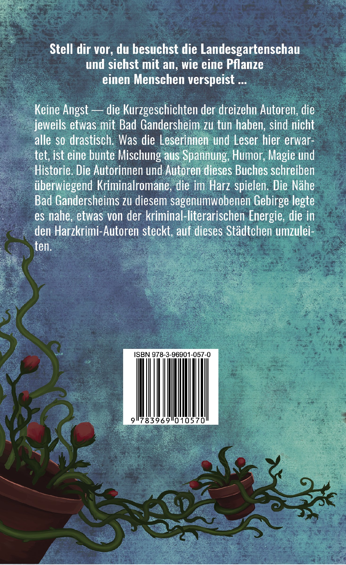Stell dir vor, du besuchst die Landesgartenschau und siehst mit an, wie eine Pflanze einen Menschen verspeist ... Keine Angst - die Kurzgeschichten der dreizehn Autoren, die jeweils etwas mit Bad Gandersheim zu tun haben, sind nicht alle so drastisch. Was die Leserinnen und Leser hier erwartet, ist eine bunte Mischung aus Spannung, Humor, Magie und Historie. Die Autorinnen und Autoren dieses Buches schreiben überwiegend Kriminalromane, die im Harz spielen. Die Nähe Bad Gandersheims zu diesem sagenumwobenen Gebirge legte es nahe, etwas von der kriminal-literarischen Energie, die in den Harzkrimi-Autoren steckt, auf dieses Städtchen umzuleiten.