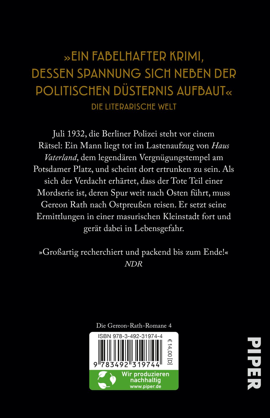 Juli 1932, die Berliner Polizei steht vor einem Rätsel: Ein Mann liegt tot im Lastenaufzug von »Haus Vaterland«, dem legendären Vergnügungstempel am Potsdamer Platz, und alles deutet darauf hin, dass er dort ertrunken ist. Kommissar Gereon Rath hat schon genug Ärger. Seine Ermittlungen gegen einen mysteriösen Auftragsmörder treten seit Wochen auf der Stelle, seine große Liebe Charlotte Ritter fängt als Kommissaranwärterin am Alex an - ausgerechnet in der Mordkommission. Und der Tote vom Potsdamer Platz scheint Teil einer Mordserie zu sein, deren Spur weit nach Osten führt.