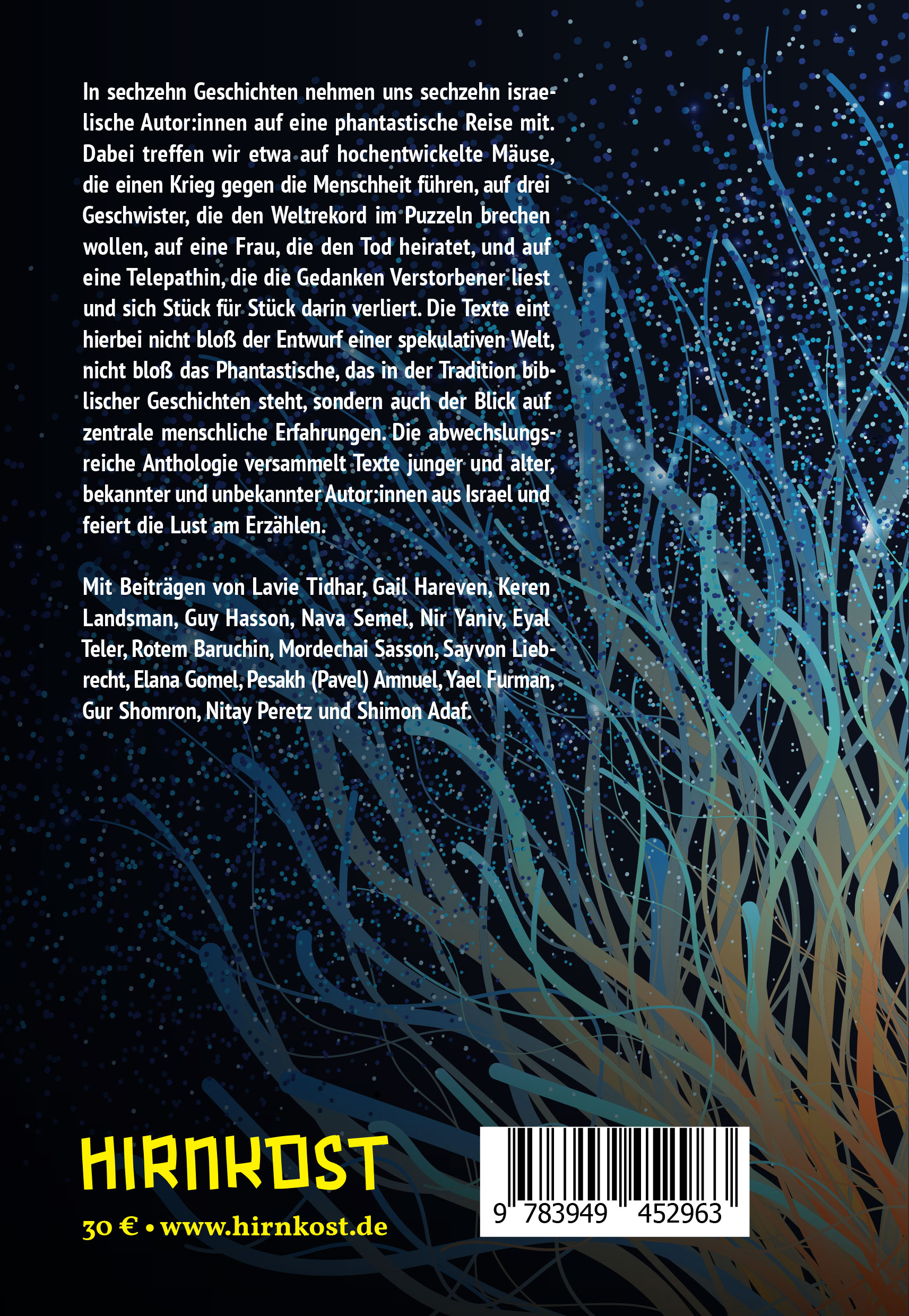 In sechzehn Geschichten nehmen uns sechzehn israelische Autor:innen auf eine phantastische Reise mit. Dabei treffen wir etwa auf hochentwickelte Mäuse, die einen Krieg gegen die Menschheit führen, auf drei Geschwister, die den Weltrekord im Puzzeln brechen wollen, auf eine Frau, die den Tod heiratet, und auf eine Telepathin, die die Gedanken Verstorbener liest und sich Stück für Stück darin verliert. Die Texte eint hierbei nicht bloß der Entwurf einer spekulativen Welt, nicht bloß das Phantastische, das in der Tradition biblischer Geschichten steht, sondern auch der Blick auf zentrale menschliche Erfahrungen. Die abwechslungsreiche Anthologie versammelt Texte junger und alter, bekannter und unbekannter Autor:innen aus Israel und feiert die Lust am Erzählen.Mit Beiträgen von Lavie Tidhar, Gail Hareven, Keren Landsman, Guy Hasson, Nava Semel, Nir Yaniv, Eyal Teler, Rotem Baruchin, Mordechai Sasson, Sayvon Lieb-recht, Elana Gomel, Pesakh (Pavel) Amnuel, Yael Furman, Gur Shomron, Nitay Peretz und Shimon Adaf.