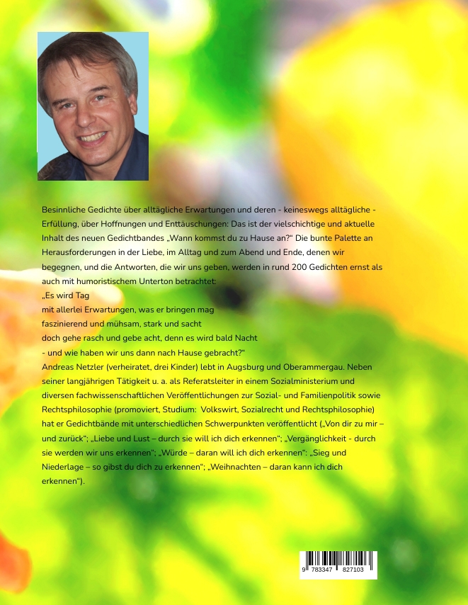 Andreas Netzler (geboren 1953, verheiratet, drei Kinder) lebt in Augsburg und Oberammergau. Neben seiner langjährigen Tätigkeit u. a. als Referatsleiter in einem Sozialministerium (volkswirtschaftliche Analysen) und diversen fachwissenschaftlichen Veröffentlichungen zur Sozial- und Familienpolitik sowie Rechtsphilosophie (promoviert, Zusatzstudium Sozialrecht und Rechtsphilosophie) sind Gedichte ein Schwerpunkt seiner Veröffentlichungen. Sein derzeit aktuellster Band (»Wann kommst du zu Hause an«) erzählt in Gedichtform Kurzgeschichten darüber - was die Liebessuche und deren Erfüllung mit uns macht, - wie wir den Alltag mit gegenseitiger Achtung - oder Gleichgültigkeit bewältigen und wie - wir uns Abschied und Tod stellen. Diese Themen werden in rund 200 Gedichten mit ernstem wie auch humoristischem Unterton betrachtet. In weiteren sechs Bänden veröffentlichte der Autor neben bereits Gedichte zur Liebe und Lust („Liebe und Lust – durch sie will ich dich erkennen“), Vergänglichkeit und Endlichkeit („Vergänglichkeit - durch sie werden wir uns erkennen“), zur Würde und Gerechtigkeit („Würde – daran will ich dich erkennen“), zum Alltag („Sieg und Niederlage – so gibst du dich zu erkennen“), zur Weihnachtszeit („Weihnachten – daran kann ich dich erkennen“) sowie „Von mir zu dir – und zurück“.