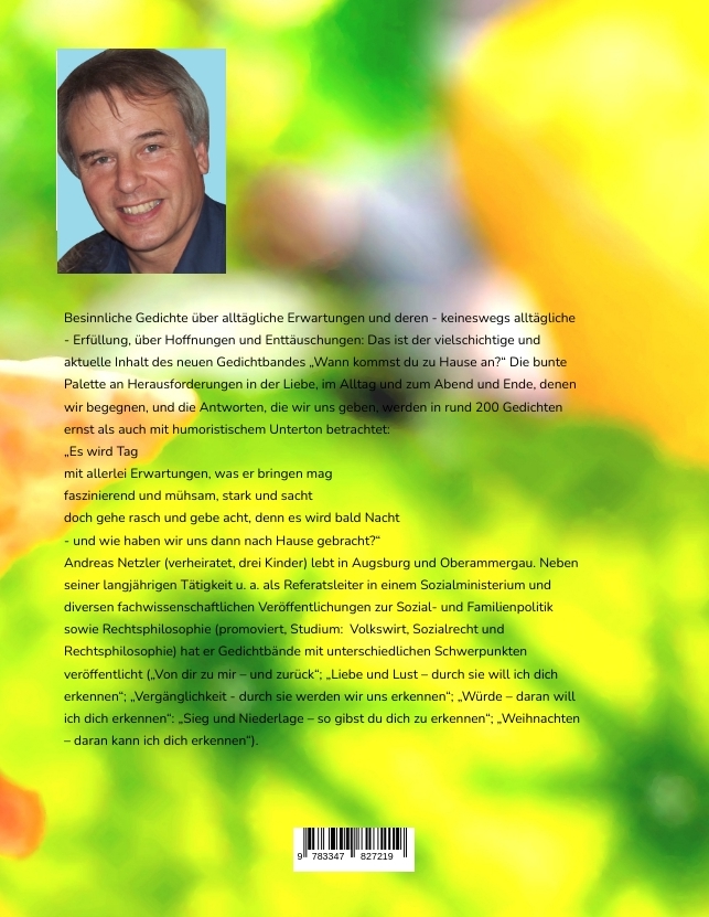 Andreas Netzler (geboren 1953, verheiratet, drei Kinder) lebt in Augsburg und Oberammergau. Neben seiner langjährigen Tätigkeit u. a. als Referatsleiter in einem Sozialministerium (volkswirtschaftliche Analysen) und diversen fachwissenschaftlichen Veröffentlichungen zur Sozial- und Familienpolitik sowie Rechtsphilosophie (promoviert, Zusatzstudium Sozialrecht und Rechtsphilosophie) sind Gedichte ein Schwerpunkt seiner Veröffentlichungen. Sein derzeit aktuellster Band (»Wann kommst du zu Hause an«) erzählt in Gedichtform Kurzgeschichten darüber - was die Liebessuche und deren Erfüllung mit uns macht, - wie wir den Alltag mit gegenseitiger Achtung - oder Gleichgültigkeit bewältigen und wie - wir uns Abschied und Tod stellen. Diese Themen werden in rund 200 Gedichten mit ernstem wie auch humoristischem Unterton betrachtet. In weiteren sechs Bänden veröffentlichte der Autor neben bereits Gedichte zur Liebe und Lust („Liebe und Lust – durch sie will ich dich erkennen“), Vergänglichkeit und Endlichkeit („Vergänglichkeit - durch sie werden wir uns erkennen“), zur Würde und Gerechtigkeit („Würde – daran will ich dich erkennen“), zum Alltag („Sieg und Niederlage – so gibst du dich zu erkennen“), zur Weihnachtszeit („Weihnachten – daran kann ich dich erkennen“) sowie „Von mir zu dir – und zurück“.