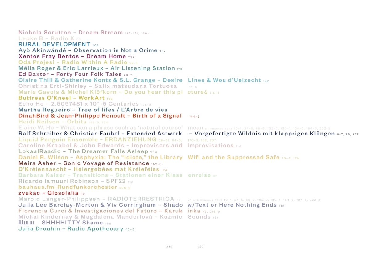 lt;p>This book explores the central themes and techniques ofartist-made radio, emerging from over 20 years of practiceby a multitude of artists in the field. It brings to thepage excerpts of long-form radio works from the world'slargest exhibition of radio art, Radio Art Zone, a joint projectby the artist duo Mobile Radio (Sarah Washington &Knut Aufermann) and the Luxembourg community stationRadio ARA, which was broadcast for 100 days as part of theprogramme of the European Capital of Culture Esch2022.Interspersed with newly commissioned works rangingfrom micro-essays and texts on radio form, practice andpoetics, to radio plays and illustrations, it is full of uniqueimages which allow the imagination to expand outwardinto radio space. Radio Art Zone performs an exquisitetransformation from airwaves to paper, providing a treasuryof ideas and reflections about radio as art.