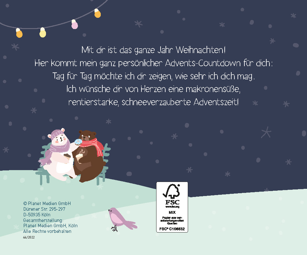 Hier kommt ein ganz persönlicher Advents-Countdown für deine Liebsten: Tag für Tag kannst du ihnen damit zeigen, wie sehr du sie magst. 24 liebevoll illustrierte Blätter mit Sprüchen und Wünschen schenken Freude und zaubern täglich ein Lächeln aufs Gesicht deiner Freunde. Der praktische Tisch-Adventskalender zum Aufstellen ist die perfekte vorweihnachtliche Deko fürs Büro oder für Zuhause.