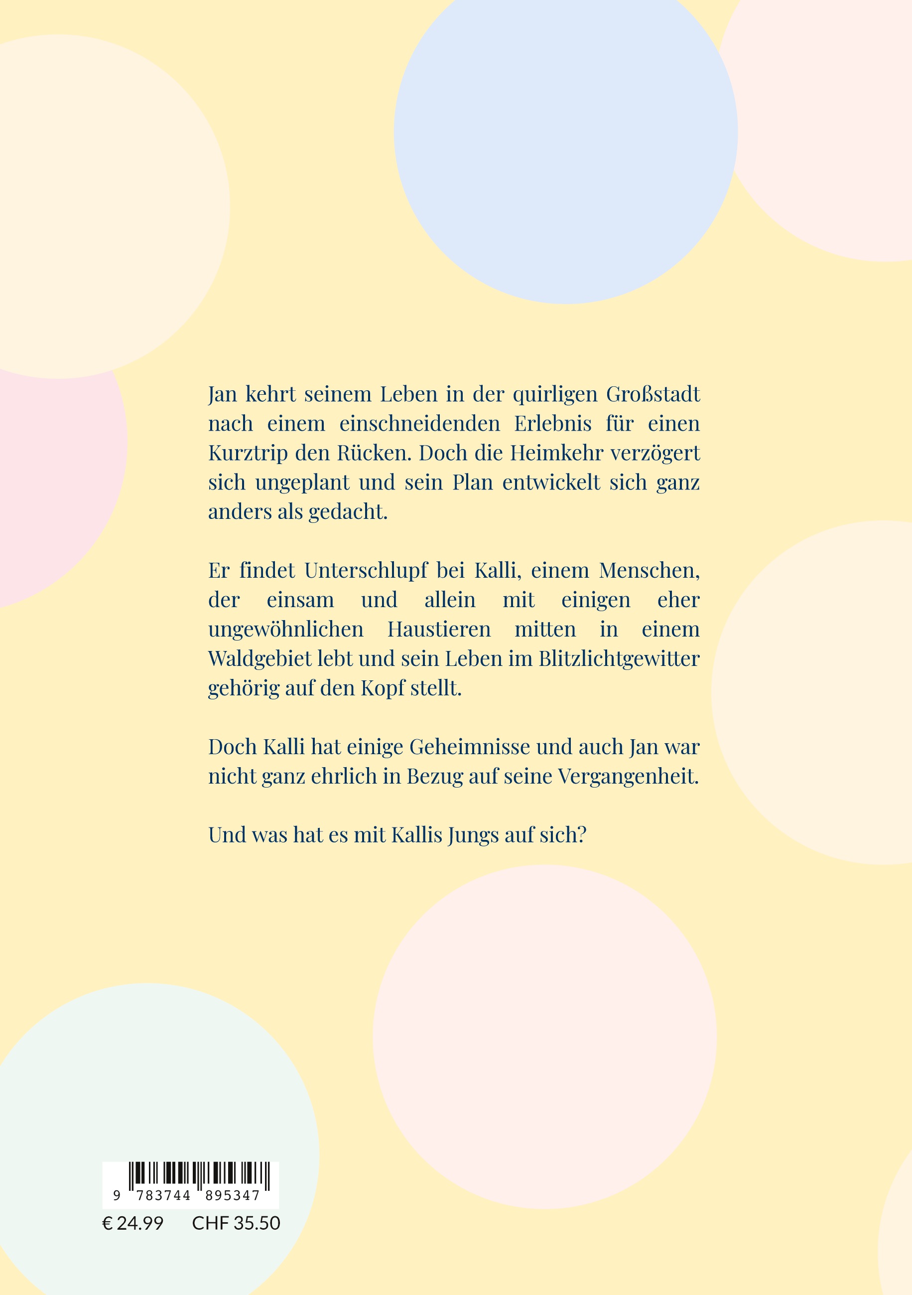 Die Traumfrau ist nur einen Kurztrip entferntNach einem einschneidenden Erlebnis kehrt Jan seinem Leben in der hektischen Großstadt für eine kurze Reise den Rücken. Doch seine Heimkehr verzögert sich ungeplant und sein Plan entwickelt sich ganz anders als gedacht.Er findet Unterschlupf bei Kalli, einem Menschen, der einsam und allein mit ein paar ungewöhnlichen Haustieren mitten im Wald lebt und sein Leben blitzschnell auf den Kopf stellt.Doch Kalli hat Geheimnisse und auch Jan war nicht ganz ehrlich, was seine Vergangenheit angeht.Und was hat es mit Kallis Jungs auf sich?